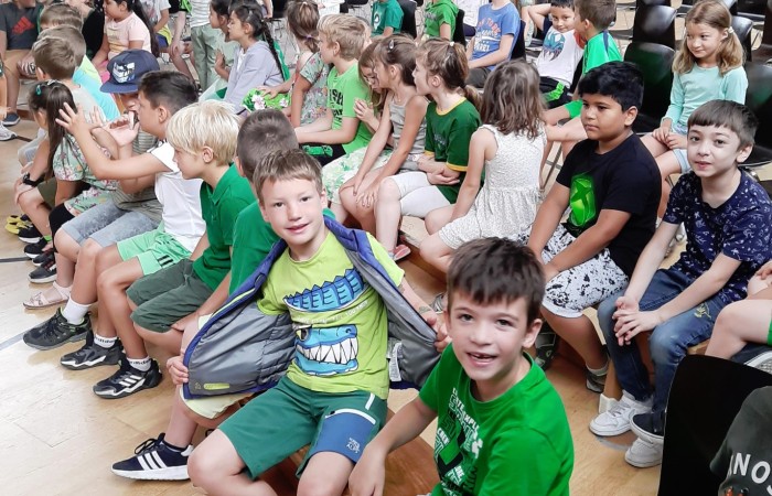 Am 30.06.2023 kamen wir grün angezogen in die Schule … warum? ...der Buchautor Armin Pongs und sein „Krokofil“ waren zu Besuch.