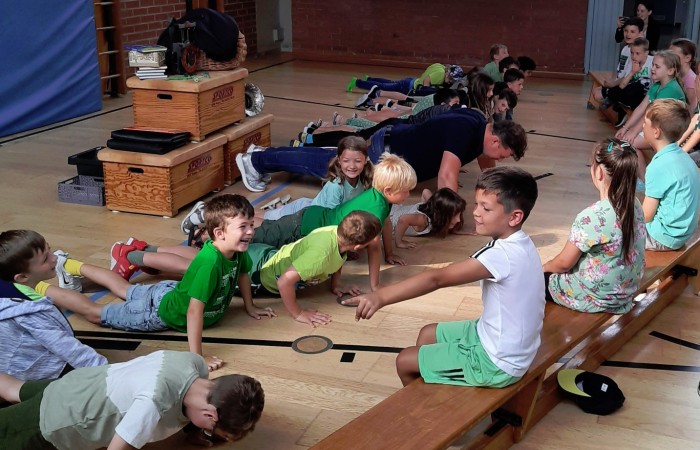 Es war eine tolle Vorlesestunde, und weil sich der Autor ein einziges Mal verlesen hatte … er las „Krokodil“ statt „Krokofil“ … musste er 10 Liegestütze machen … natürlich machten wir eifrig mit!