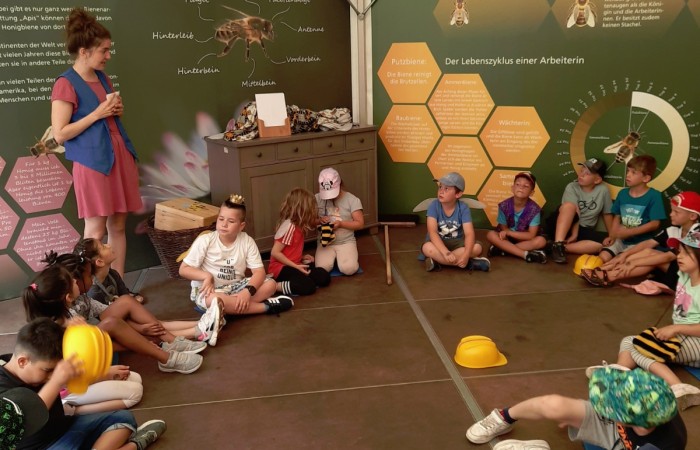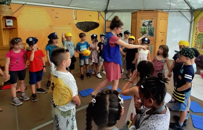 Zunächst erfuhren wir im Bienenzelt wie ein Bienenvolk funktioniert … wir beobachteten die Bienen im Bienenstock und durften selbst ein Bienenvolk spielen … das war sehr interessant!
