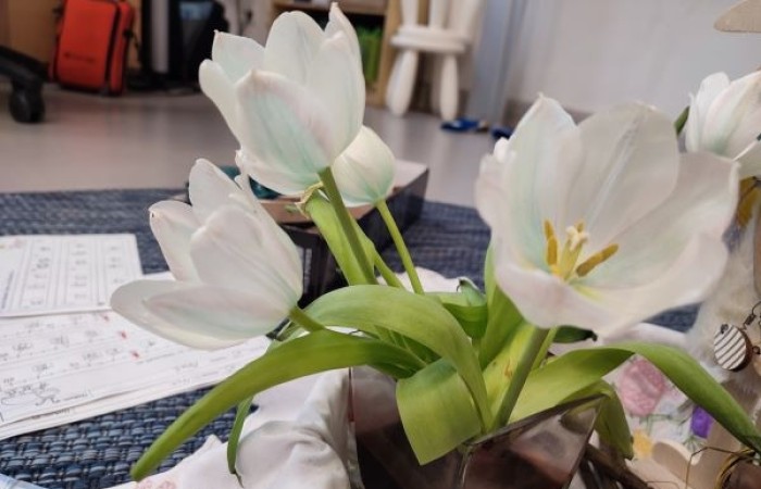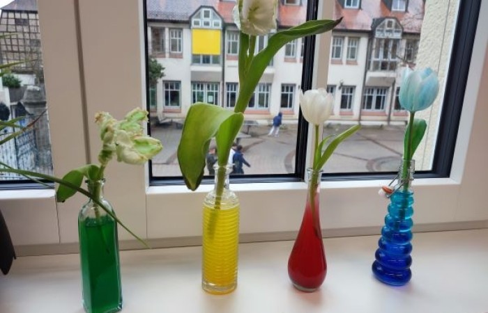 Um unsere Kreismitte zu schmücken, hatte ein Schüler weiße Tulpen mitgebracht. Diese wurden direkt verwendet, um ein Experiment zu starten.