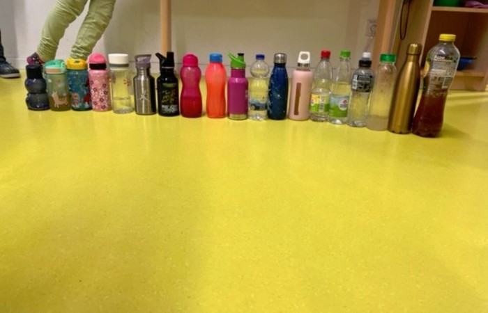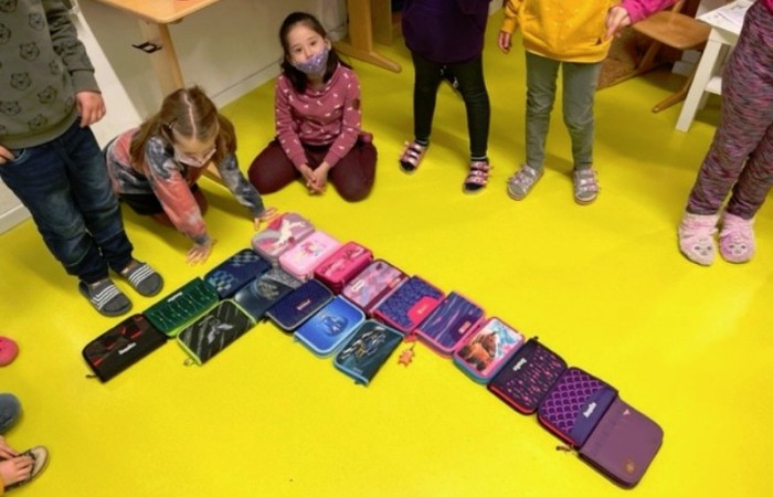 Bevor es losging, schauten wir uns verschiedene Bilder von seiner künstlerischen Arbeit an und dann durften wir auch schon loslegen. Wir räumten nach Wehrlis Art auf: Magnete, Schultaschen, Trinkflaschen, Federmäppchen… Am Ende unseres Projekts stellten wir uns nach unseren Körpergrößen auf.