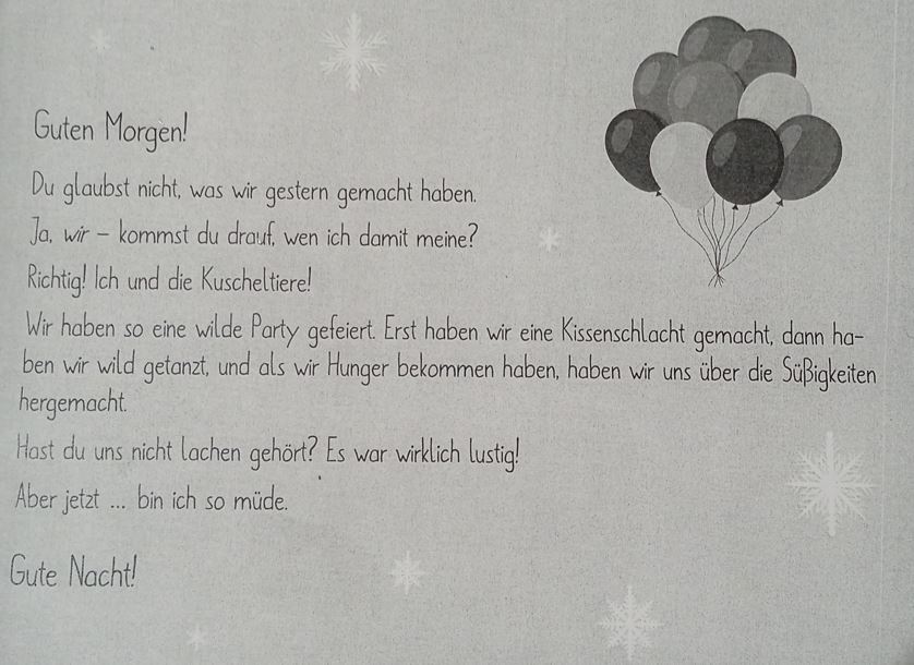 Er hat uns nun jeden Tag im Dezember mit einem kleinen Brief überrascht. Einmal hat er im Klassenzimmer Plätzchen versteckt. Außerdem hat er das Klassenzimmer weihnachtlich geschmückt. Besonders lustig fanden wir es, als er unserer Lehrerin einen Marmeladen-Bart ins Gesicht gemalt hat, als sie schlief. Gestern hat er eine Weihnachtsparty mit allen Kuscheltieren gefeiert. Ab und zu schreiben auch wir ihm einen Brief. Dann antwortet er uns sofort am nächsten Tag und erzählt uns tolle Geschichten aus seinem Wichtel-Leben.