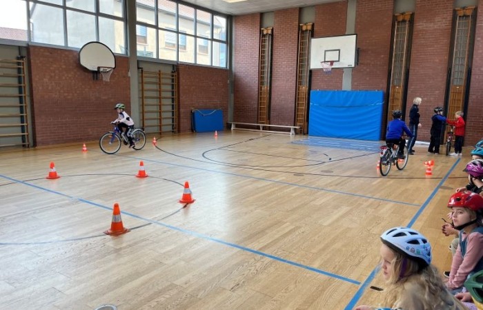 Zwei Polizisten kamen in unsere Turnhalle, um mit den Kindern ein spannendes Fahrrad-Geschicklichkeitstraining durchzuführen.
