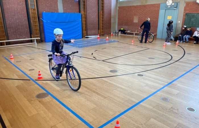 Dafür hatte die Polizei einen Parcours aufgebaut. Die Schülerinnen und Schüler mussten im Slalom einige Kurven meistern, über eine Rampe fahren und sich auf ihre Balance konzentrieren. Besonders wichtig war das Üben des Schulterblicks über die linke Schulter – eine wichtige Fähigkeit für sicheres Fahren im Straßenverkehr. Auch das Fahren mit nur einer Hand wurde geübt, um sicher Handzeichen geben zu können.