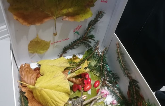 Gemeinsam mit Frau Augustin haben wir uns schon Blätter und Früchte der Bäume angeschaut, haben verschiedene Holzsorten, Tannenzapfen und Blätter erfühlt und auch daran gerochen. Besonders lustig finden wir die „Nasenzwicker“ des Ahorns.