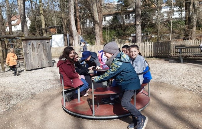 Nach der Pflanzaktion hatten die Kinder die Möglichkeit, aus Ästen und Stöcken Tippis zu bauen. Auf dem Rückweg zur Schule wurde ein kurzer Stopp auf dem Spielplatz eingelegt.