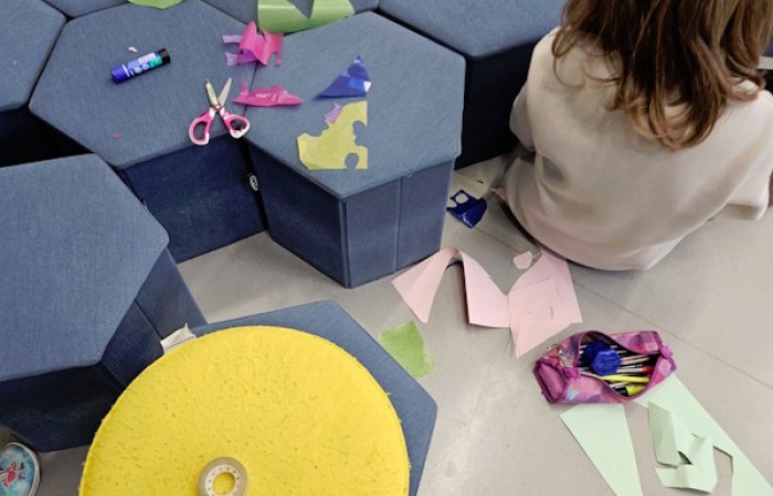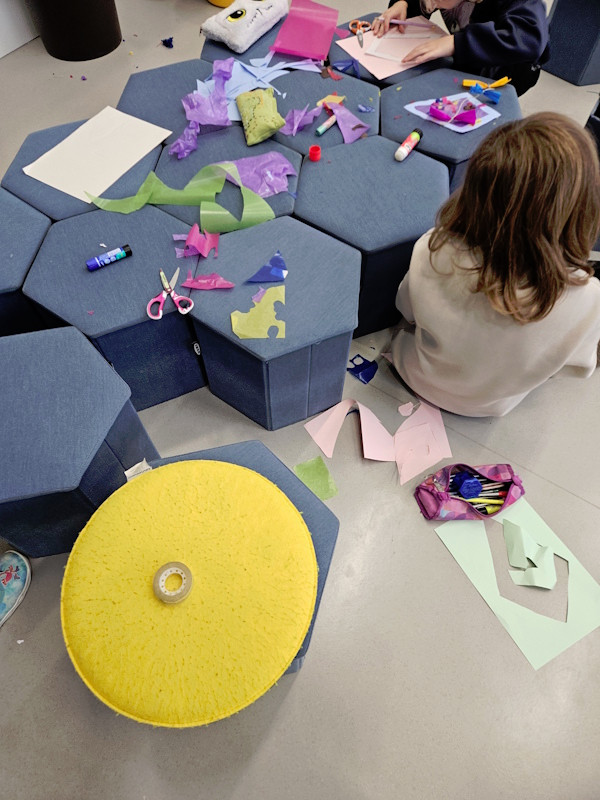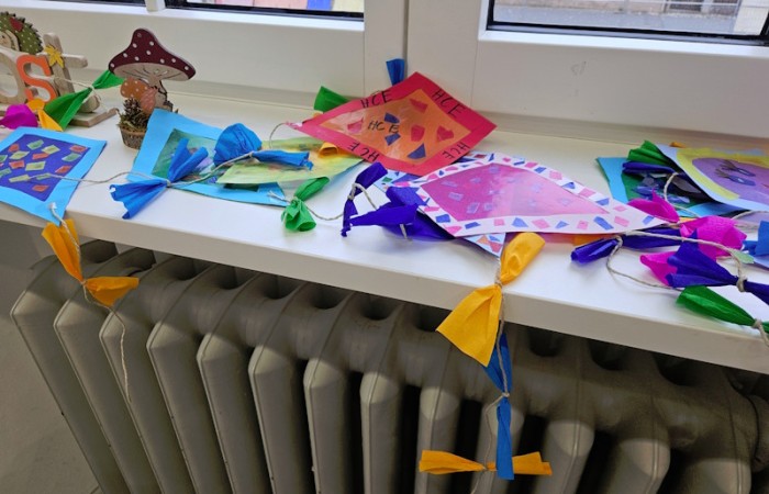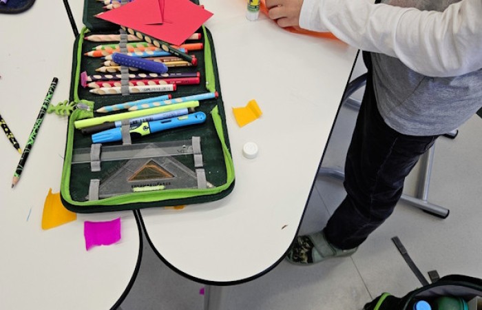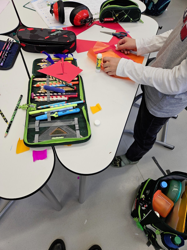 Passend zur Jahreszeit bastelten die Kinder in den ersten Kunststunden leuchtende Drachen aus Ton- und Transparentpapier. Nach einem kleinen Drachenrätsel durfte jedes Kind seinen eigenen Drachen gestalten. Mit Schnur und Kreppband aufgehängt, flattern sie nun fröhlich an unseren Fenstern und bringen Farbe und Leben in den Klassenraum.