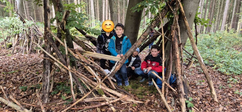 Im Wald angekommen, war die Hauptaufgabe klar: Lager bauen! Mit unglaublicher Kreativität und viel Teamgeist verwandelten sich die Schülerinnen und Schüler in echte Wald-Architekten. Äste wurden geschleppt und Wände aus Laub gefertigt. Es war beeindruckend zu sehen, wie alle zusammenhalfen.