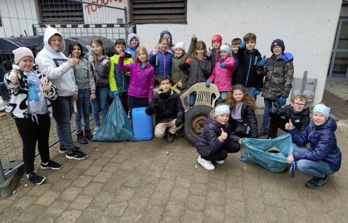 Wie auch in den Jahren davor ärgerten wir uns maßlos über die vielen weggeworfenen Zigarettenkippen. Auf dem Festplatz und um ihn herum fanden wir viele interessante Sachen: ein Brillengestell, E-Zigaretten, einen Plastikstuhl, Autoräder, einen Kochtopf, einen Kanister eine Gießkanne, einen Eimer und vielen kleinen Unrat. Aus der Bleich fischten wir auch wieder verschiedenen Müll. Unserer Müllsäcke waren zum Schluss so schwer, dass wir sie kaum schleppen konnten.