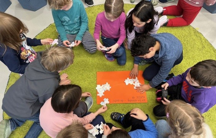 Jedes Kind ist einmalig – mit eigenen Stärken, Interessen und Vorlieben. Doch gemeinsam bilden sie eine starke Klassengemeinschaft. Um das sichtbar zu machen, gestalteten die Schülerinnen und Schüler jeweils ein eigenes Puzzleteil, das ihre Individualität widerspiegelt. Anschließend wurden alle Teile zu einem großen Klassenpuzzle zusammengesetzt. So wurde deutlich: Jeder Einzelne ist wichtig und zusammen bilden wir eine bunte und wertvolle Gemeinschaft.