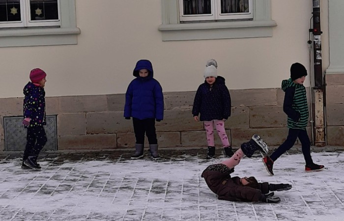 Das war ein Spaß ! Nach dem 3. Advent fiel der erste Schnee. Fröhlich rutschten die Kinder im Schlosshof auf einer Schlitterbahn und bauten kleine Schneemänner.