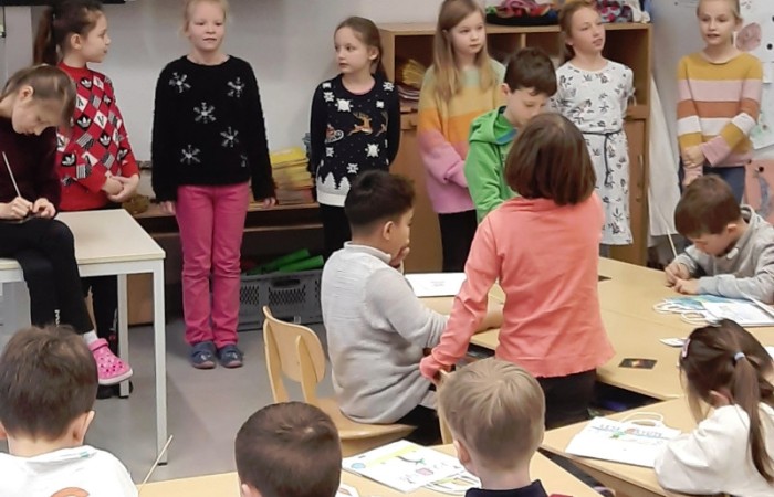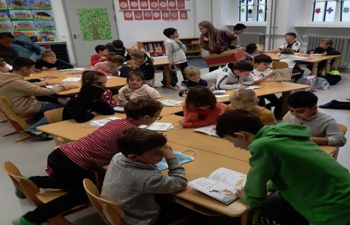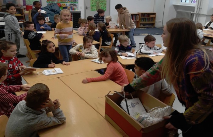 Anschließend besuchte uns die Partnerklasse 3a und bereitete uns eine große Freude. Die Drittklässler trugen Weihnachtsgedichte vor, lasen aus einem Buch und schenkten den Erstklässlern Lesetüten.