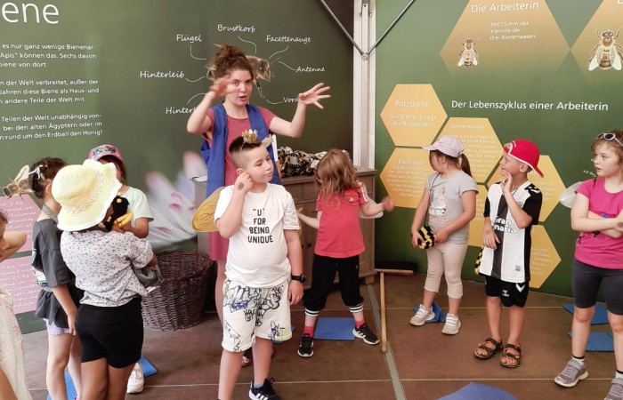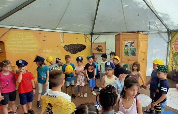 Zunächst erfuhren wir im Bienenzelt wie ein Bienenvolk funktioniert … wir beobachteten die Bienen im Bienenstock und durften selbst ein Bienenvolk spielen … das war sehr interessant!