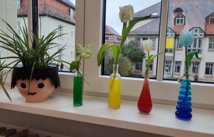So färbten wir das Wasser in einzelnen Vasen in den Farben blau, grün, rot und gelb. In eine Vase mischten wir alle Farben zusammen und stellten fest, dass diese einzeln in der Blüte wieder auftauchten.