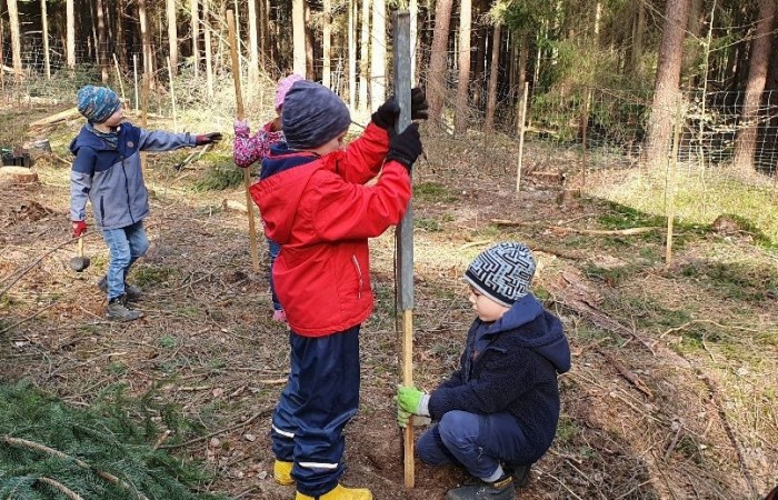 Dort empfing uns Förster Käßer und erklärte das Vorgehen und die Besonderheiten beim Baum pflanzen. Eifrig machten sich alle ans Werk und pflanzten verschiedene heimische Baumarten, um den Erhalt des Waldes zu unterstützen und somit einen Beitrag zum Umweltschutz zu leisten. Jede Gruppe hatte abschließend ein eigenes Bäumchen gepflanzt und mit einem Namensschild versehen, sodass sich das eigene Bäumchen bei einem Besuch im Wald schnell wiederfinden lässt.