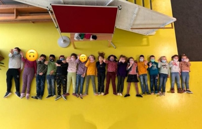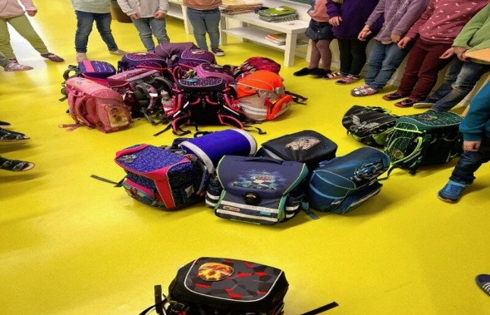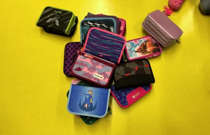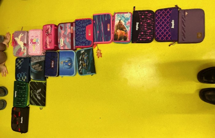 Bevor es losging, schauten wir uns verschiedene Bilder von seiner künstlerischen Arbeit an und dann durften wir auch schon loslegen. Wir räumten nach Wehrlis Art auf: Magnete, Schultaschen, Trinkflaschen, Federmäppchen… Am Ende unseres Projekts stellten wir uns nach unseren Körpergrößen auf.