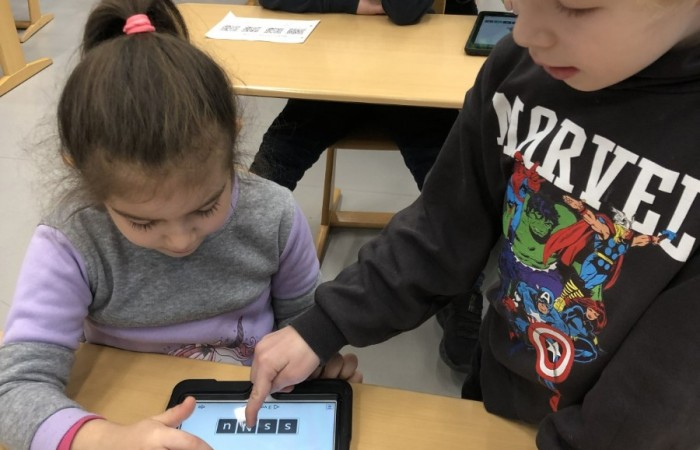 Die Schüler haben schon viel gelernt, haben sich an die Abläufe gewöhnt und können mit bekannten Aufgabenformaten schon selbstständig üben. Damit das so wichtige Üben aber auch interessant bleibt und Spaß macht, hat Frau Leistner ganz tief in die Trickkiste – besser gesagt in den Tabletkoffer – gegriffen. Im Fach Deutsch durften die Kinder vielfältige Übung zum neuen Buchstaben diesmal am Tablet interaktiv bearbeiten. Es gab Übungen zum Laute hören, zum Silben zählen und lesen.