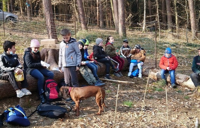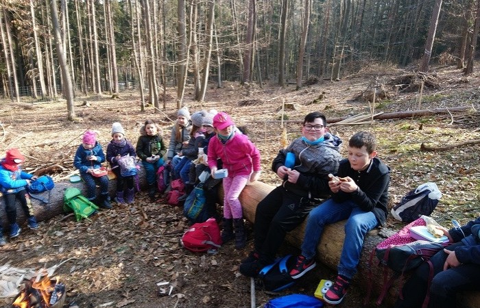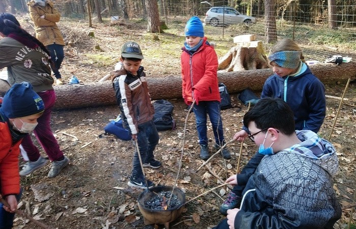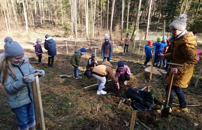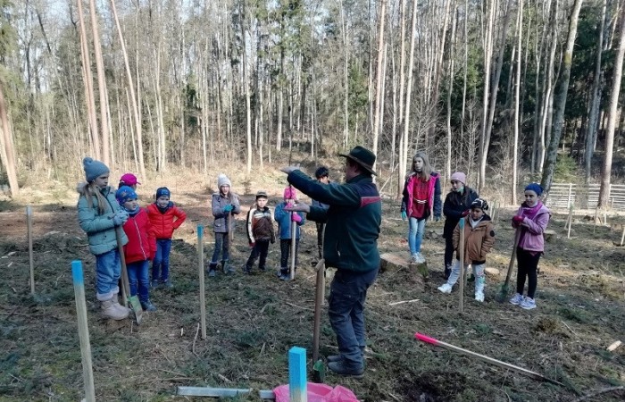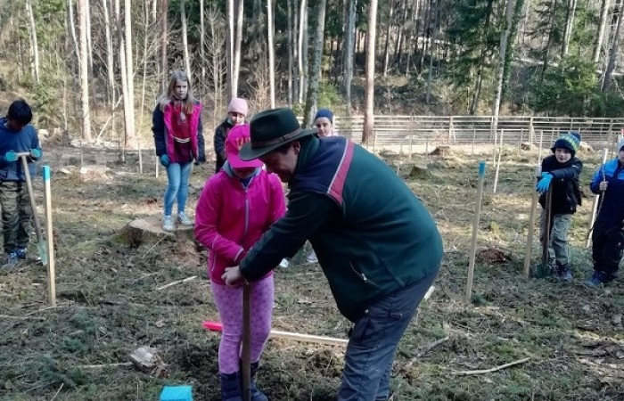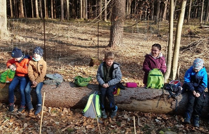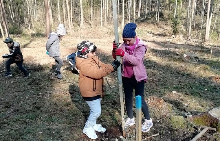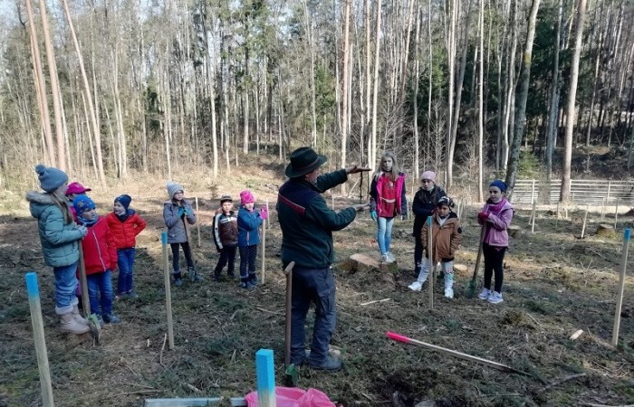 Im Vorfeld waren wir sehr aufgeregt und freuten sich schon sehr, denn die Baumpflanzaktion stand bevor. Kurz nach Schulbeginn machten wir uns auf den Weg in den Schulwald. Dort empfing uns der Förster mit einem kleinen Lagerfeuer und wir durften zunächst eine kurze Pause machen. Danach schnappte sich jeder einen Spaten und Herr Käßer erklärte er uns, wie wir die Eichen und Ulmen pflanzen müssen. Alle hörten ganz aufmerksam zu. Immer ein Erstklässler pflanzte mit einem Drittklässler einen Baum an der markierten Stelle. Ohne die Hilfe des anderen hätten wir sonst nicht das Loch dafür ausheben können. Nachdem das kleine Bäumchen gesetzt war, beschrifteten wir die Pfosten mit Namen, damit wir ihn wiederfinden, wenn wir das nächste Mal im Wald sind. Nach einer kurzen Spielpause ging es schon wieder zurück in die Schule. Wir sind gespannt, wie schnell die Bäume wachsen.