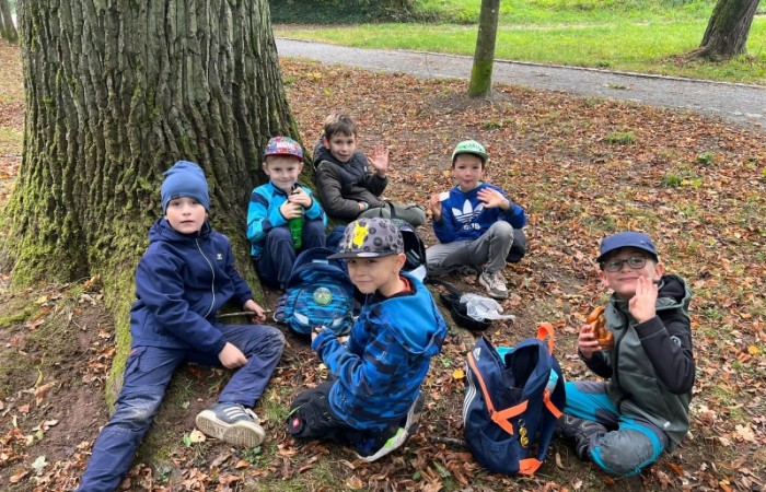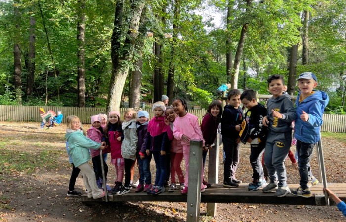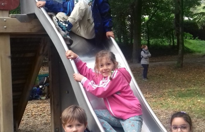 Zwar hatten wir nur wenig Sonnenschein, dafür ist es aber zumindest trocken geblieben. Bei unserem ersten Halt im Wald sind wir viel herum geklettert und haben bunte Blätter, Moos und allerlei andere herbstliche Naturschätze gefunden. Anschließend hatten wir noch viel Spaß auf dem großen Spielplatz mit Schaukeln, Wippen und dem Karussell. Nach einigen Gruppenfotos ging es dann auch schon wieder zurück zur Schule.