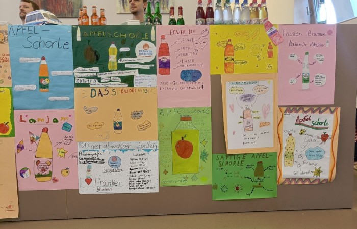 Zusätzlich waren im Foyer unsere Werbeplakate für die alkoholfreien Getränke der Firma FrankenBrunnen aufgehängt, die der Elternbeirat verkaufte. Die dritten und vierten Klassen entwarfen und gestalteten diese im Rahmen eines Werbe-Projekts.