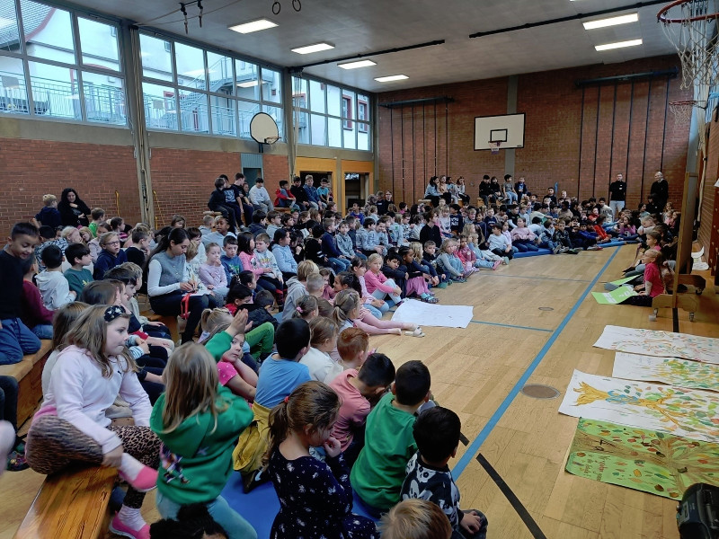 Alle Schüler begaben sich in der zweiten Stunde in die Turnhalle, um sich über ihre Schule viele Gedanken zu machen. Der Inhalt der Schulversammlung wurde von den zweiten Klassen mit Unterstützung durch Frau Röder moderiert.