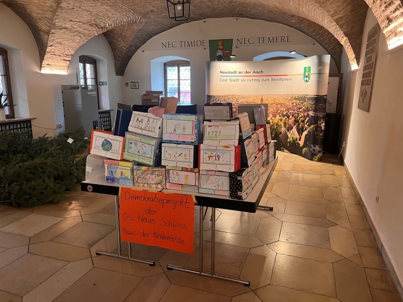 Zum Abschluss unseres Projekts durften wir im Neustädter Rathaus ein Kinderrechtshaus bauen. Dafür gestalteten wir Schuhkartons und malten die Kinderrechte darauf, die uns am wichtigsten sind. Aus allen Kartons entstand ein großes Haus, welches unsere Ideen und Wünsche widerspiegelte.