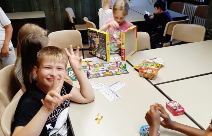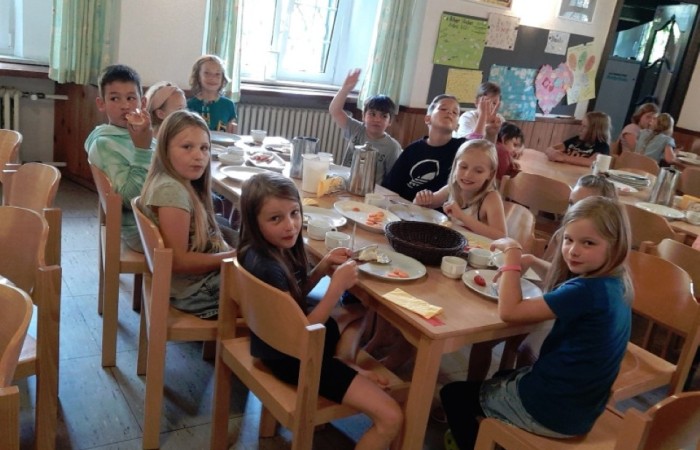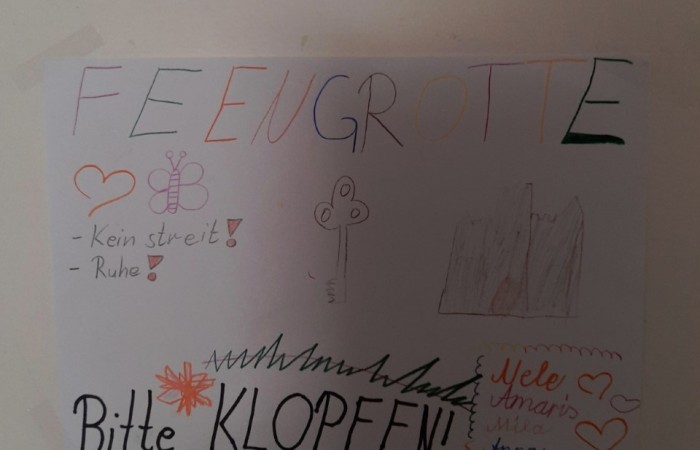 Natürlich brauchte jedes Zimmer einen eigenen coolen Namen und Song… für diese kreative Arbeit gingen wir in unser gemütliches Klassenzimmer unter dem Dach. Dort spielten wir auch am 1. Abend verschiedene Spiele und naschten ein bisschen.