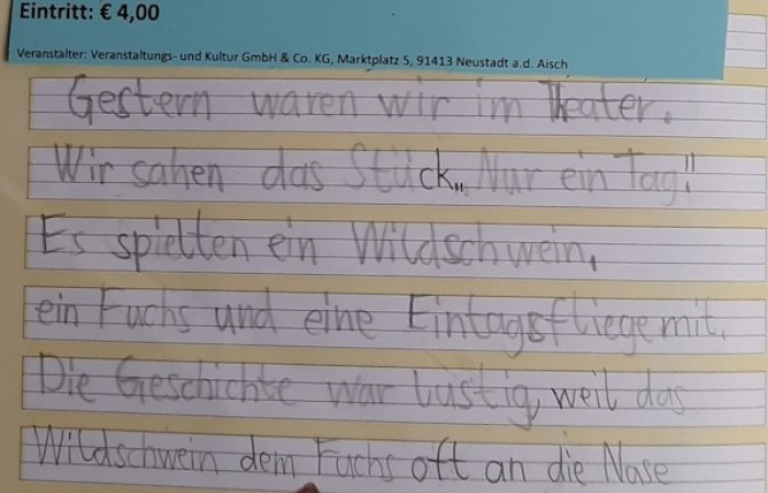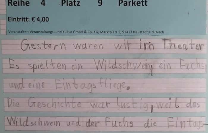 Am Donnerstag, den 16. November besuchten die zweiten Klassen die NeuStadtHalle. Das Theater Chapeau Claque aus Bamberg war mit seinem Stück „Nur ein Tag“ zu Besuch in Neustadt. Es war eine sehr berührende Geschichte, denn Wildschwein und Fuchs versuchen der Eintagsfliege einen unvergesslich schönen Tag zu bescheren, was ihnen auch gelingt … es war sehr lustig … jedoch auch am Schluss traurig … ein sehr interessantes Theatererlebnis!
