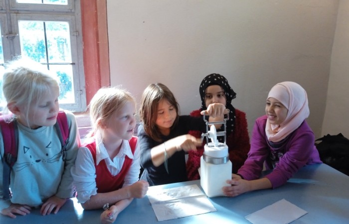 Um die Butter herzustellen, füllten wir Sahne in Butterfässer. Alle Kinder durften fleißig mithelfen, die Sahne zu Butter zu schlagen. Als Klasse wurden wir für diese doch anstrengende Arbeit mit leckerem Butterbrot belohnt.