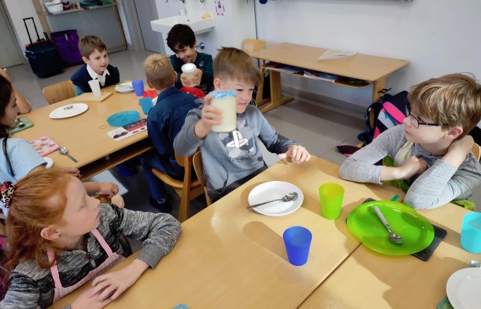 Natürlich wurden die zubereiteten Sachen danach gemeinsam und in gemütlicher Runde bei einem Glas Kuhmilch verspeist.