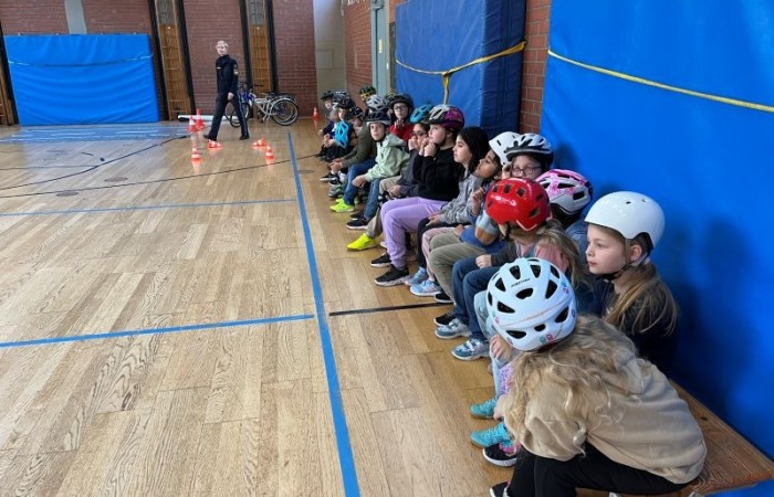Zwei Polizisten kamen in unsere Turnhalle, um mit den Kindern ein spannendes Fahrrad-Geschicklichkeitstraining durchzuführen.