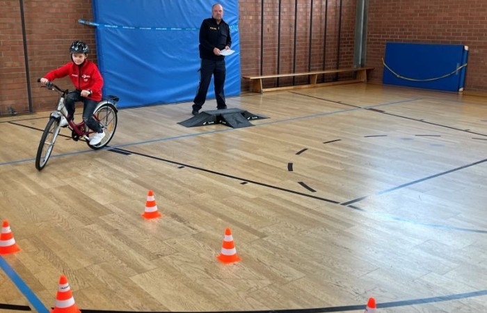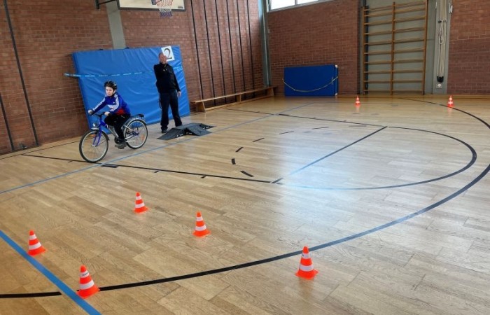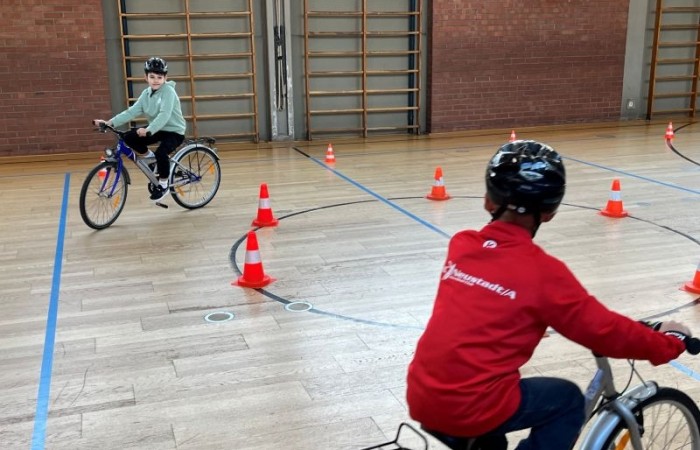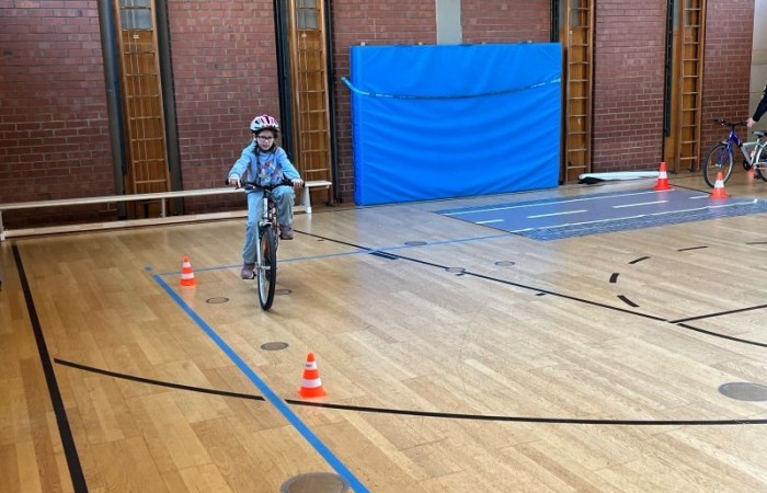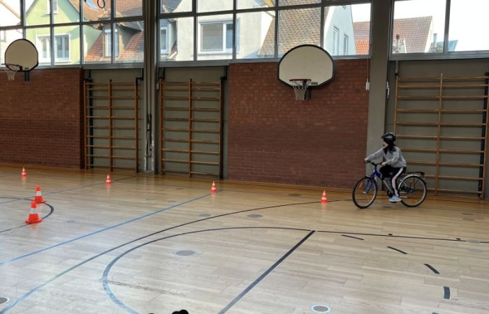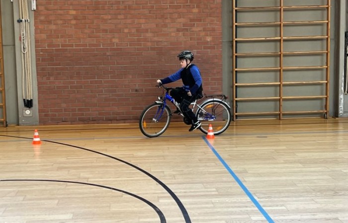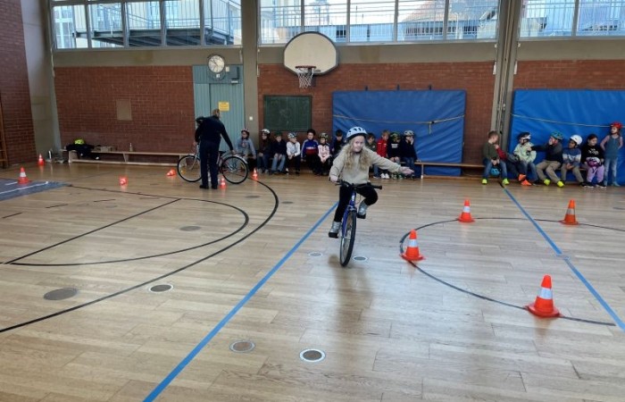 Dafür hatte die Polizei einen Parcours aufgebaut. Die Schülerinnen und Schüler mussten im Slalom einige Kurven meistern, über eine Rampe fahren und sich auf ihre Balance konzentrieren. Besonders wichtig war das Üben des Schulterblicks über die linke Schulter – eine wichtige Fähigkeit für sicheres Fahren im Straßenverkehr. Auch das Fahren mit nur einer Hand wurde geübt, um sicher Handzeichen geben zu können.