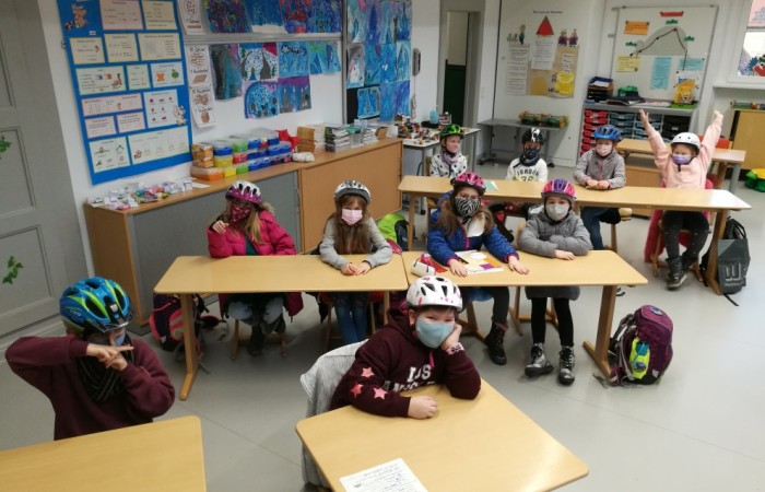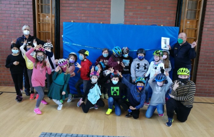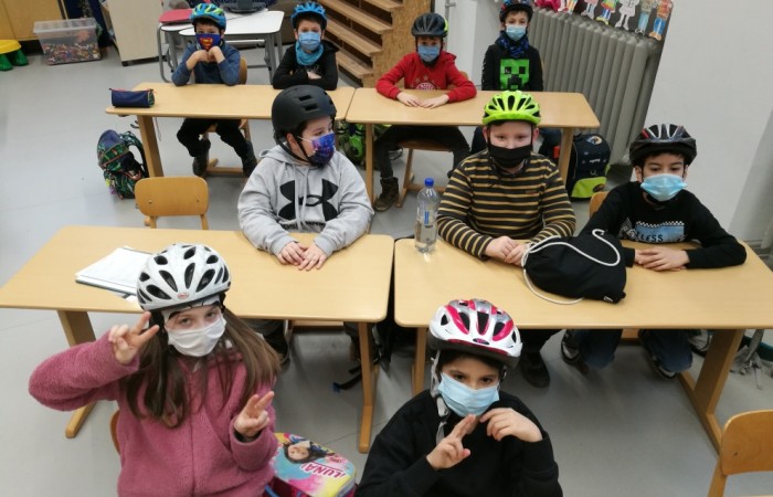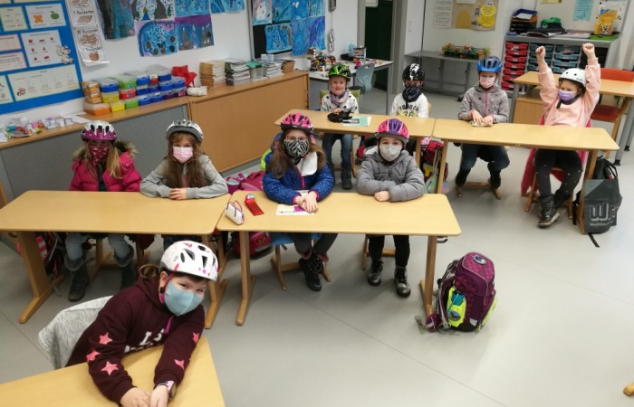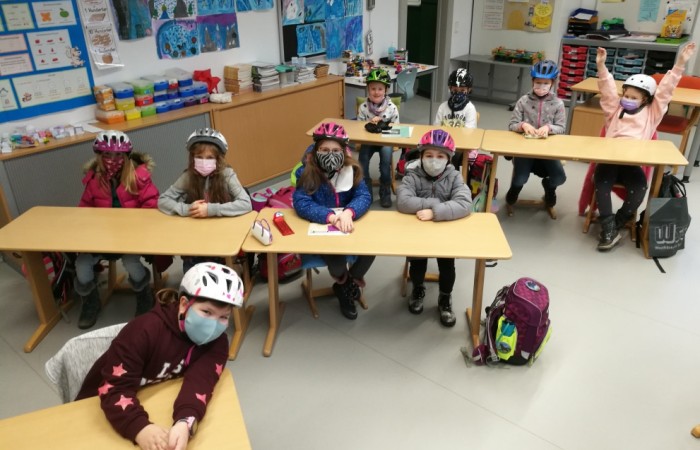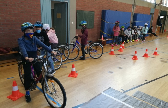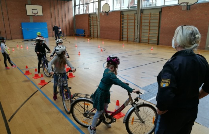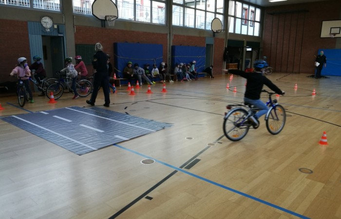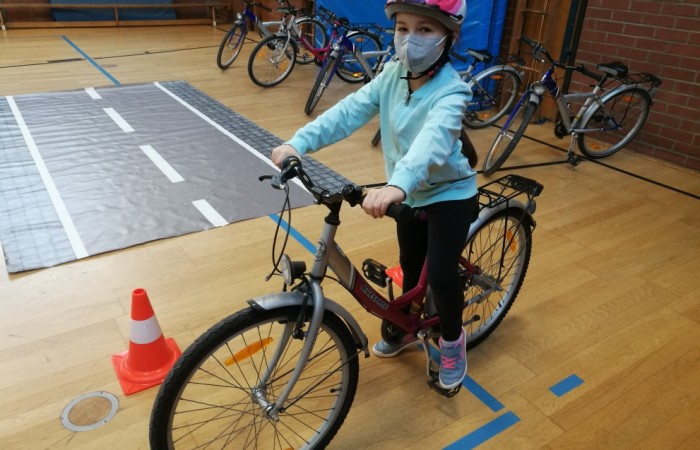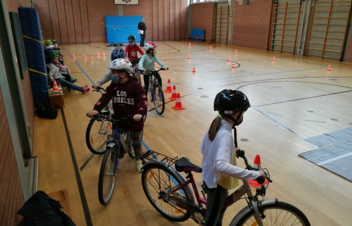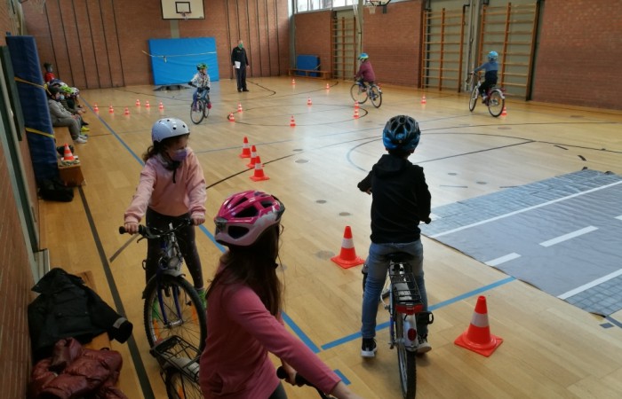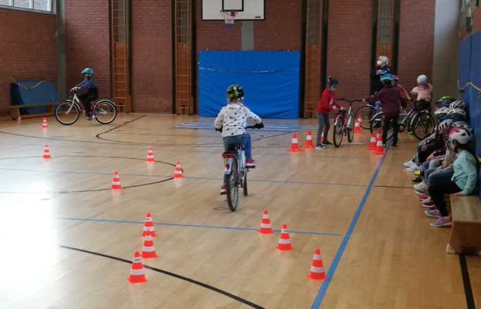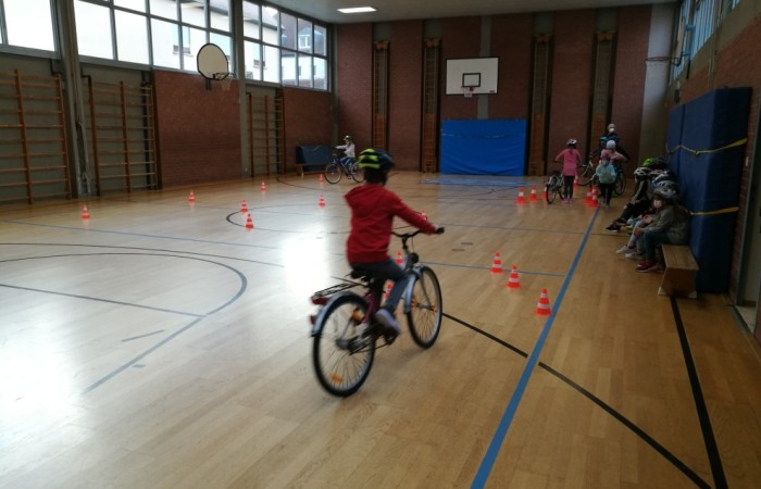 Am 17.2.22, während draußen der Sturm tobte, übten wir in der Turnhalle mit den Fahrrädern.