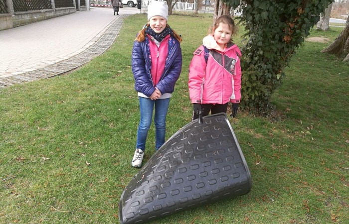 Wir machten uns auf den Weg die Stadt sauberer zu machen und der Umwelt zu helfen. Ausgerüstet mit Handschuhen, Müllbeuteln, Müllzwickern und einem Eimer zogen wir los. Zuerst säuberten wir unseren Pausenhof und mussten dabei feststellen, dass unzählige Zigarettenkippen auf dem Boden und in den Hecken lagen. Danach gingen wir in die Bleiche und fischten sehr viel Plastikmüll aus dem Bleichweiher. Sogar eine Gummimatte für einen Kofferraum war dabei. Auch hier lagen unendlich viele Zigarettenkippen. Wir konnten sie gar nicht alle aufheben. Pause machten wir auf dem dortigen Spielplatz.
