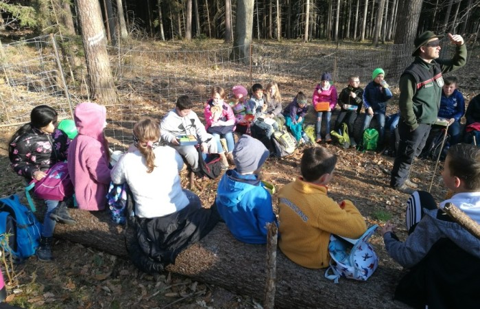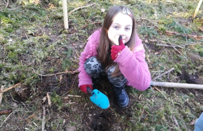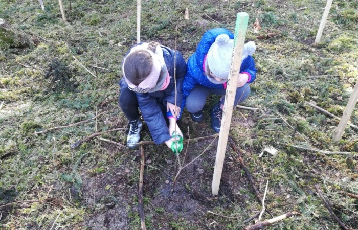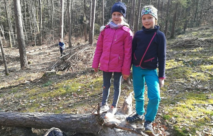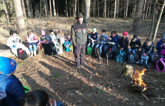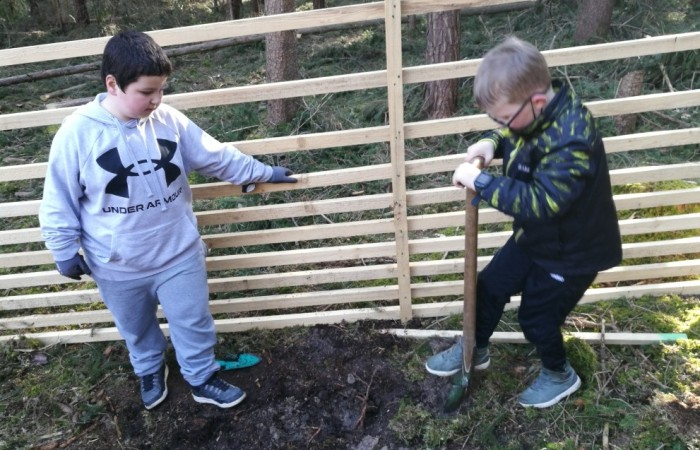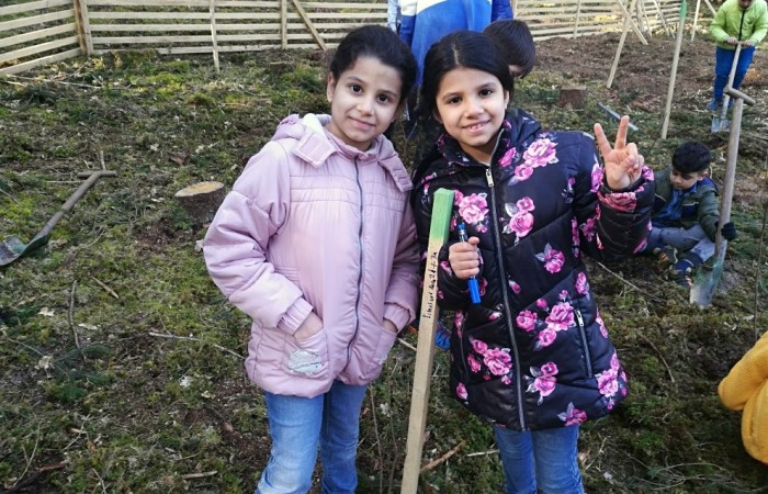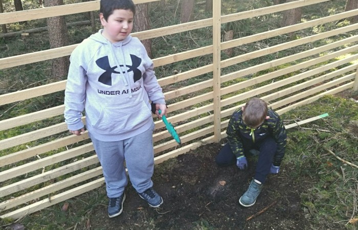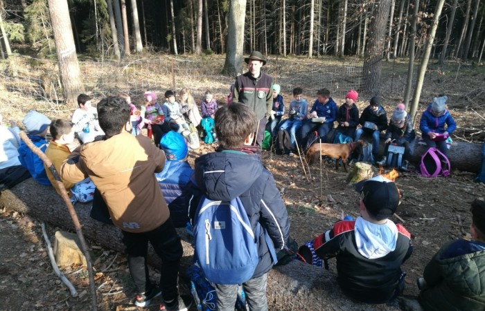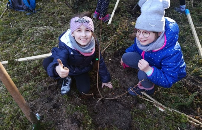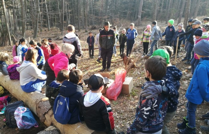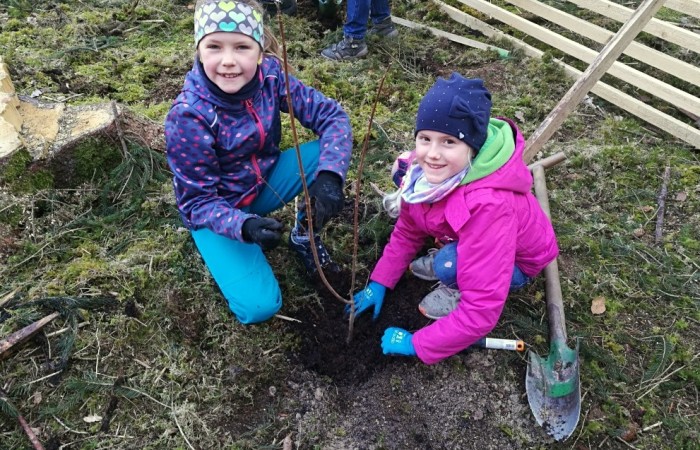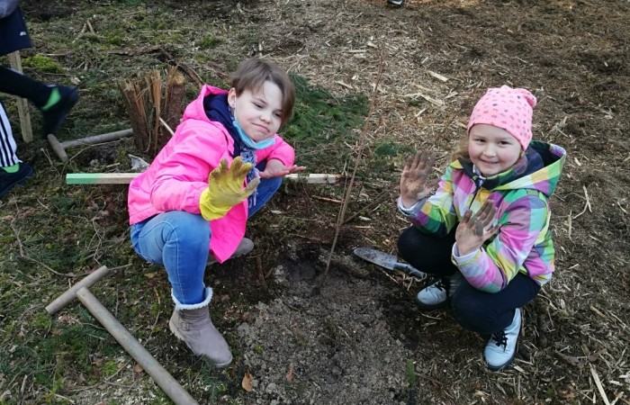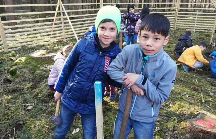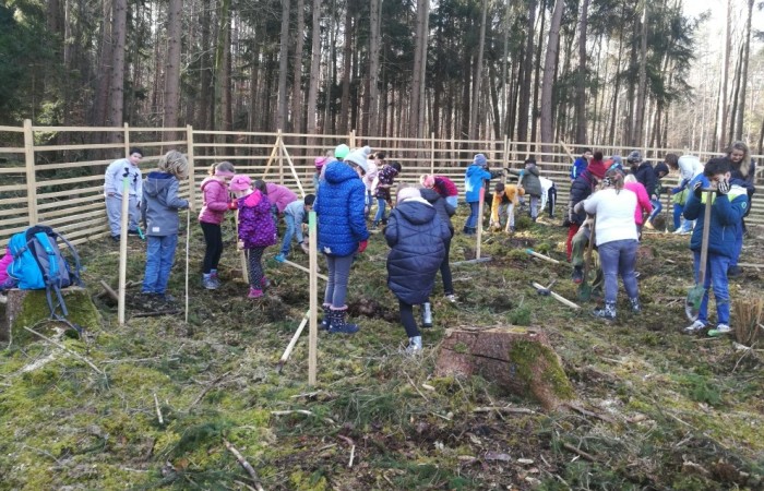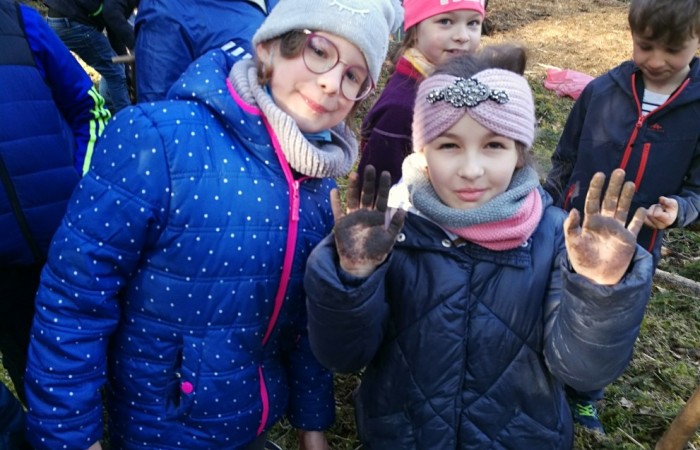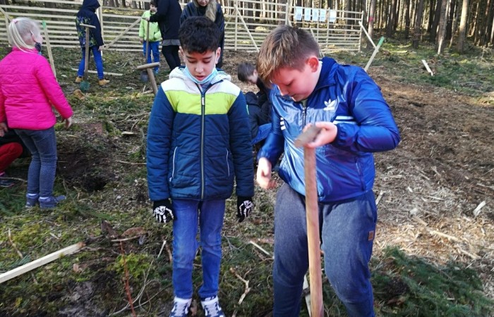 Am 28.3.2022 trafen sich die 3a, die 2a und die 2d im Schulwald, um gemeinsam mit Herrn Förster Käßer und seinem Hund Fritzi Feldahorn und Robinien zu pflanzen.