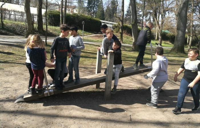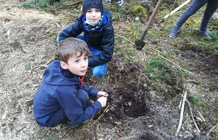 Es wurde diesmal nicht im Schulwald gepflanzt, sondern etwas unterhalb. Die Sparkasse initiierte gemeinsam mit der Berufsschule und der GS Neues Schloss das Projekt „Klimaschutzwald“ Mitarbeiter der Sparkasse pflanzten schon Bäume und die Berufsschule baute die Zäune für das Gelände. Die Grundschüler pflanzten ihre Bäume in einem Kreis immer abwechselnd Feldahorn und Robinie. Der Feldahorn wird sehr groß und schütz deshalb die Robinie. Diese Baumsorten kommen sehr gut mit dem wärmeren und trockneren Klima zurecht.