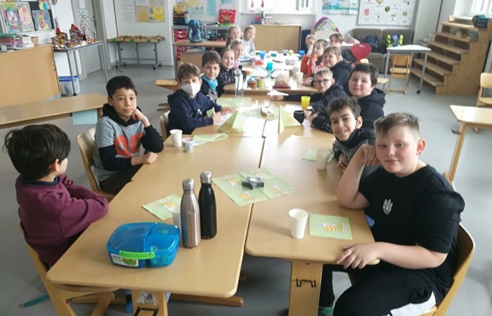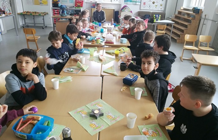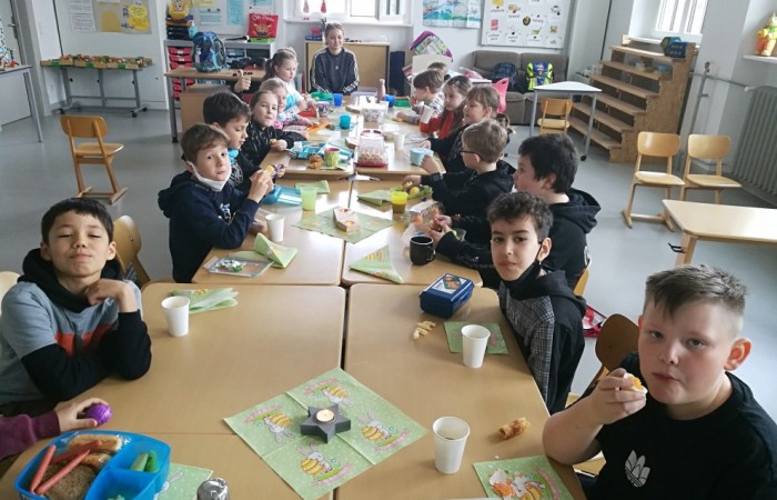 Nach der ersten Pause schoben wir gemeinsam unsere Tische im Klassenzimmer zu einer langen Tafel zusammen. Wir dekorierten den Tisch mit Osterservietten und Kerzen. Dann packte jeder sein Osterfrühstück aus, denn die Speisen gemeinsam vorbereiten durften wir noch nicht. Zu trinken gab es Kakao, Wasser und alles was wir uns mitgebracht hatten. So frühstückten wir am letzten Schultag vor den Osterferien zusammen in aller Ruhe. Kurz vor Schulende bekamen wir noch unsere selbstgebastelten Ostertütchen, die der Osterhase gefüllt hatte.