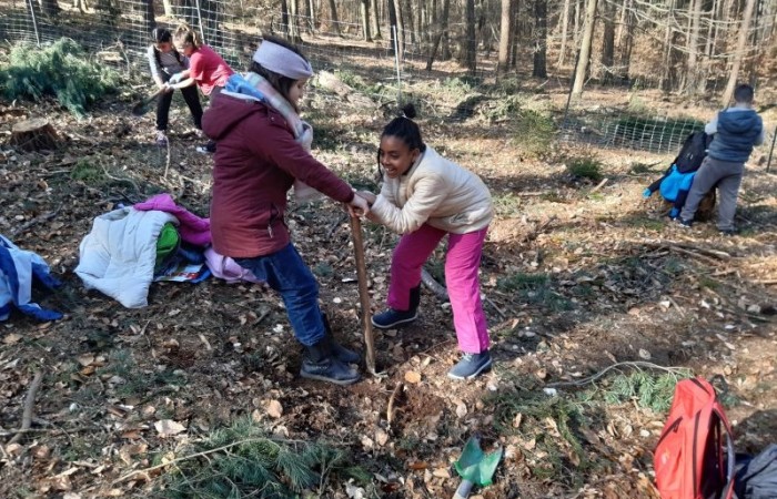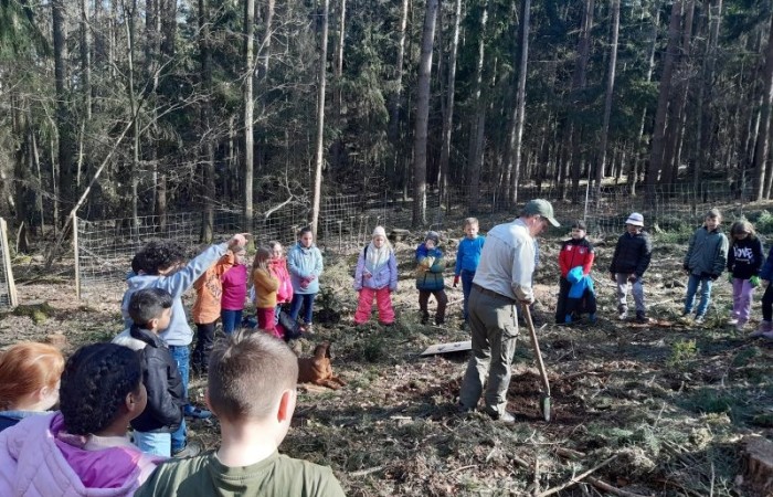 Am 21.03.2025 besuchten die Klassen 3a und 3b gemeinsam den Schulwald, um dort unter Anleitung von Förster Herr Käßer kleine Tannen zu pflanzen.