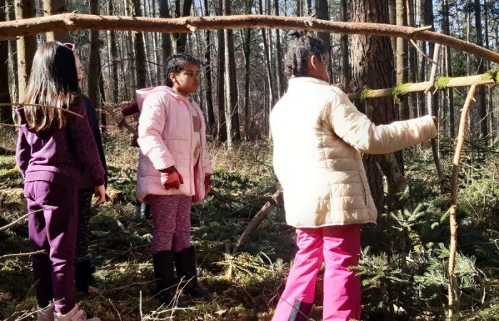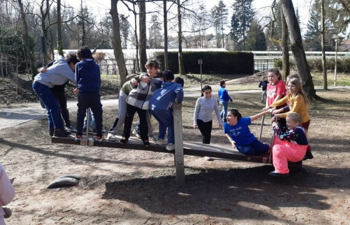 Nach der Pflanzaktion hatten die Kinder die Möglichkeit, aus Ästen und Stöcken Tippis zu bauen. Auf dem Rückweg zur Schule wurde ein kurzer Stopp auf dem Spielplatz eingelegt.