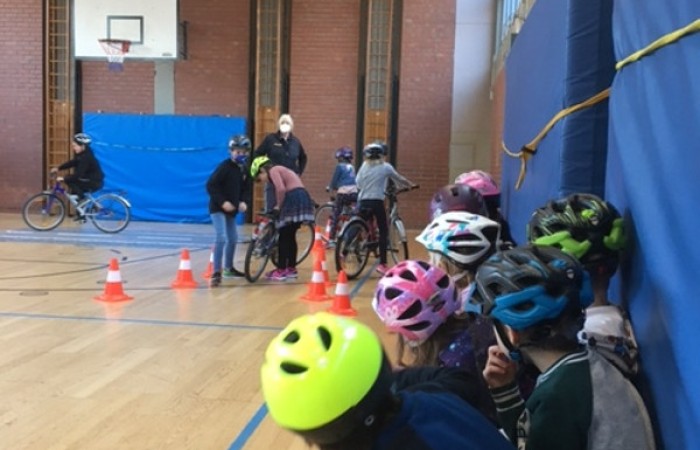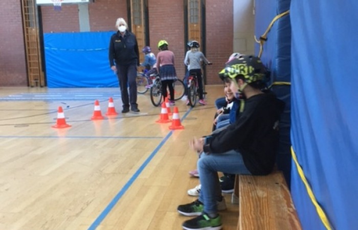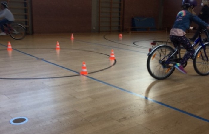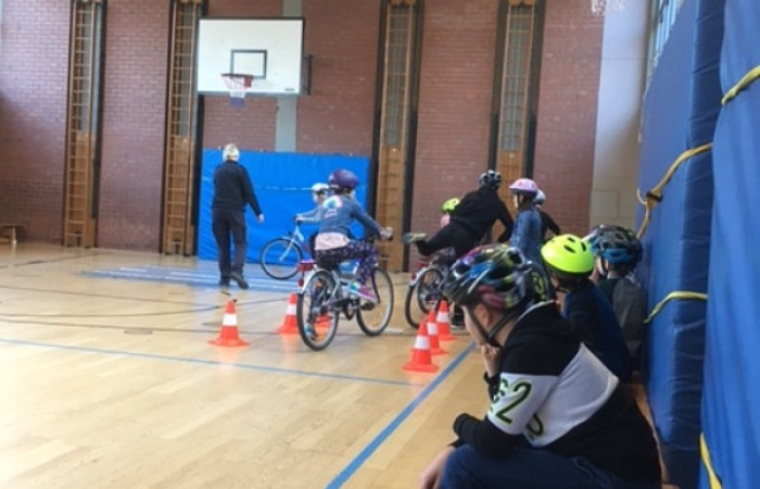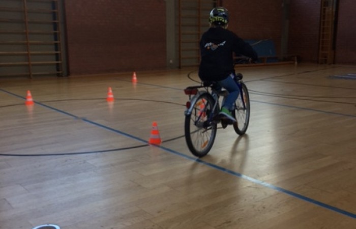So bereiteten uns Frau Lang und Herr Witt die Sporthalle vor. Wir konnten Slalomfahren üben, das Fahren über ein Hindernis und auch das so notwendige rückwärts Umdrehen. Nach einigen Trainingsrunden versuchten wir uns auch am Fahren mit einer Hand , mal mit der linken, mal mit der rechten. Diese Übung brauchen wir später ganz dringend für die Zeichengebung am Fahrrad.