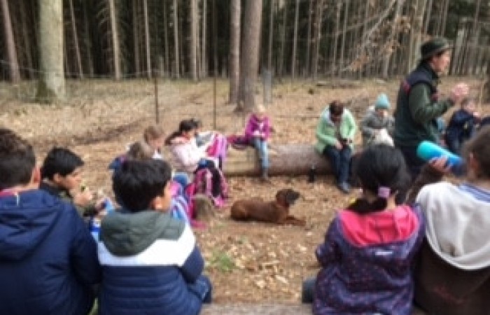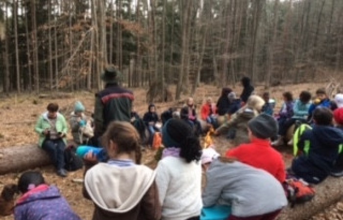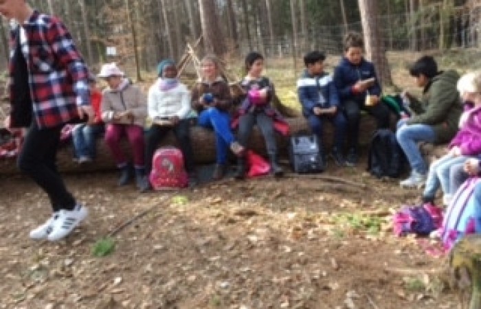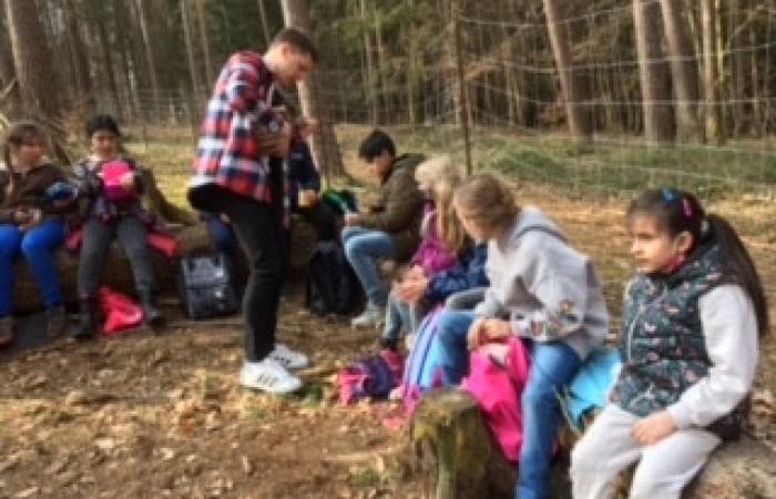 Wir die 3 b waren am Dienstag mit der Klasse 1b zusammen im Schulwald. Bevor wir ankamen sahen wir von weitem schon eine blasse Rauchsäule. Dann sahen wir auch Herrn Käßer, der mit Hund Fritzi auf uns wartete. Die Rauchsäule war ein kleines Feuer in einer Feuerschale. Wir suchten uns einen Platz auf den Baumstämmen und machten erst einmal Pause.