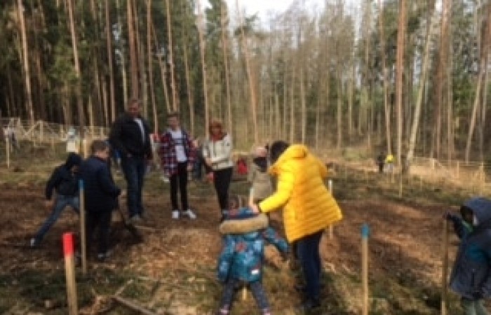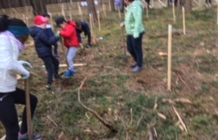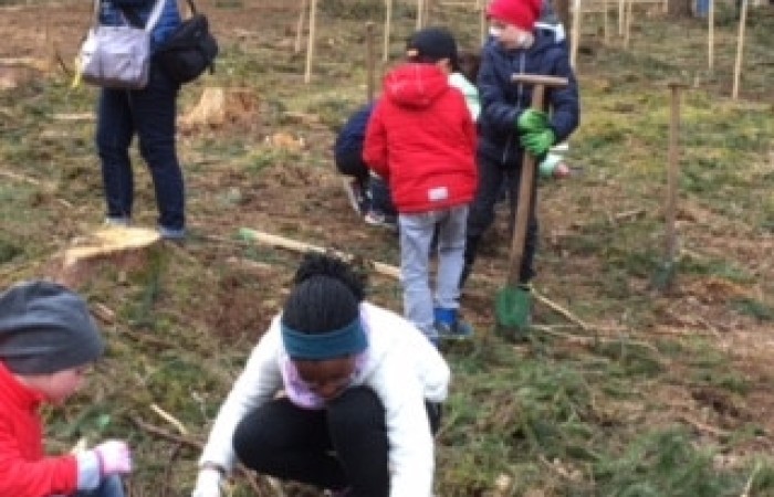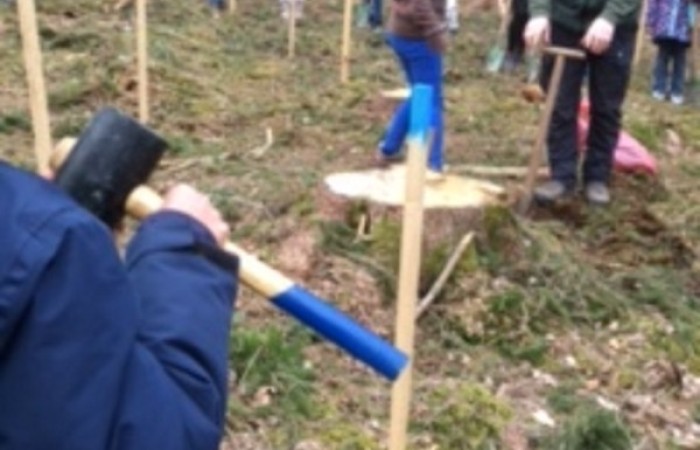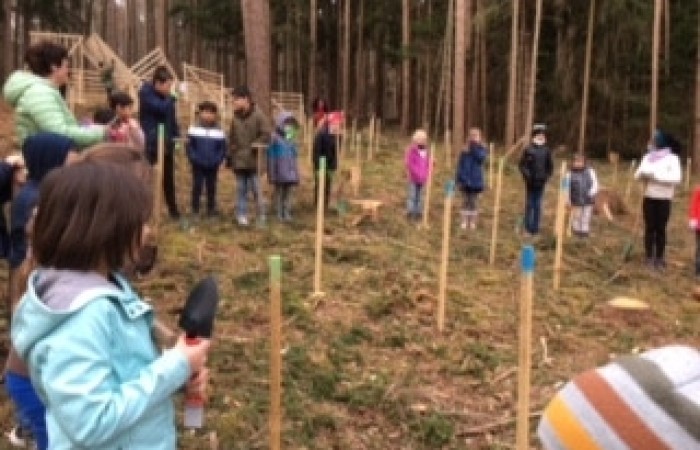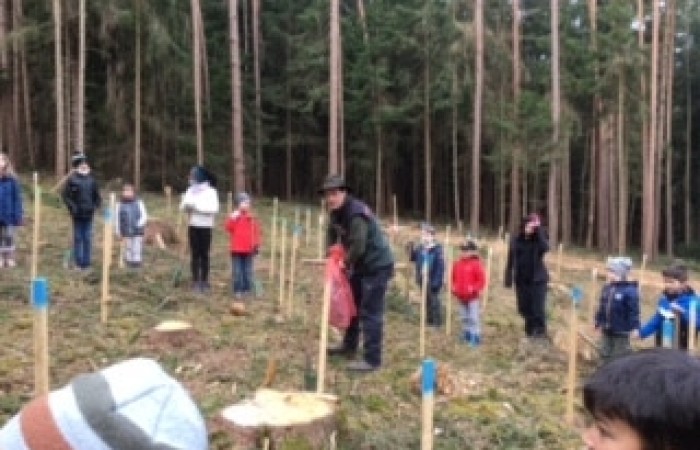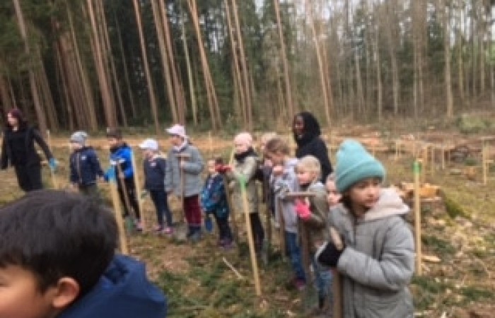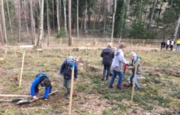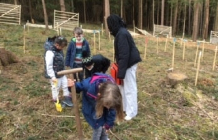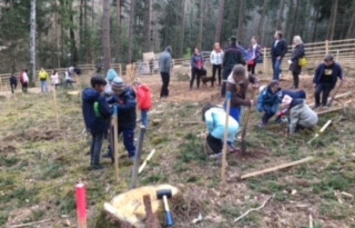 Danach sind wir mit Spaten bewaffnet nach unten in den Klimawald der Sparkasse gegangen. Dort haben wir 2 bis zu 5 Bäume, nach Anleitung von Herrn Käßer gepflanzt. Es war auch die Presse da und sie hat von uns Fotos gemacht. Schüler aus der Berufsschule hatten Einzäunungen gezimmert. Diese befestigten sie zum Schutz unserer neuen Bäumchen.
