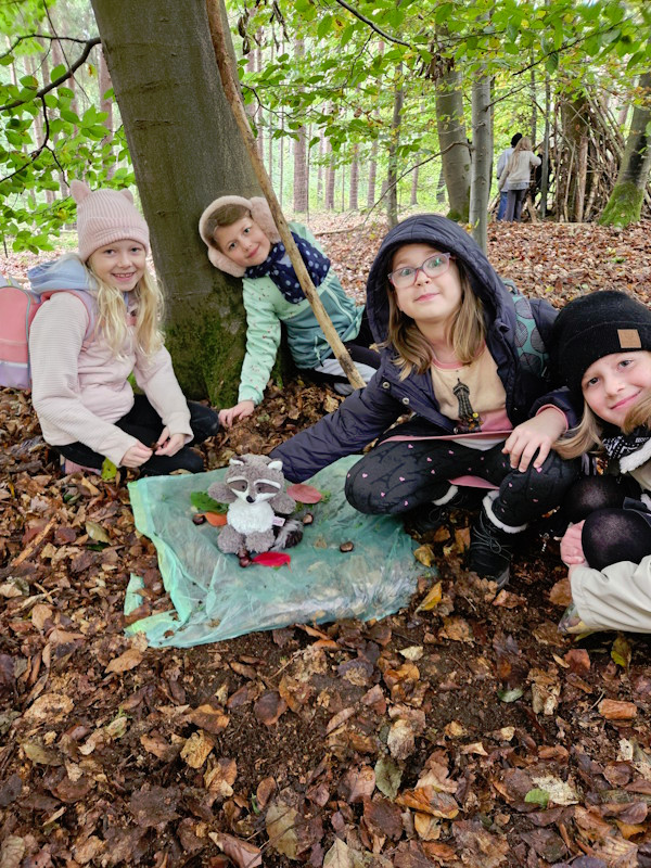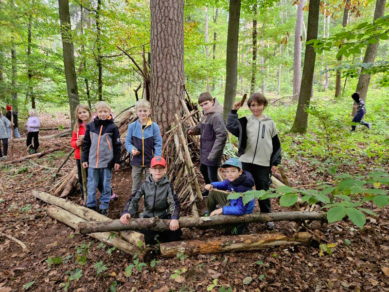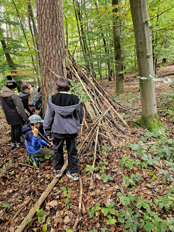 Im Wald angekommen, stärkten wir uns zuerst bei einer gemütlichen Pause. Danach ging es ans Lagerbauen – mit viel Kreativität, Teamgeist und Spaß! Es war toll zu sehen, wie alle Kinder zusammengeholfen haben. Die Ergebnisse konnten sich wirklich sehen lassen – kleine Waldlager aus Ästen, Blättern und Moos entstanden überall. Auch Willi hat in jedem Lager seinen Platz bekommen. Die Zeit verging wie im Flug, und am liebsten wären viele Kinder noch länger geblieben. Auf dem Rückweg waren die Beine zwar etwas müde, aber das Gefühl, gemeinsam etwas erlebt zu haben, war einfach wunderbar.