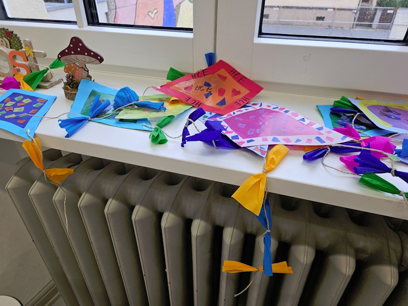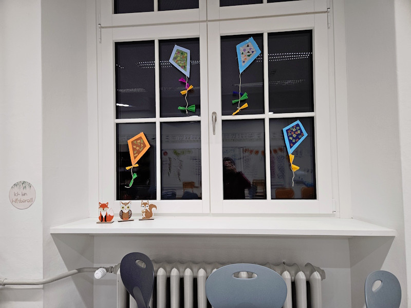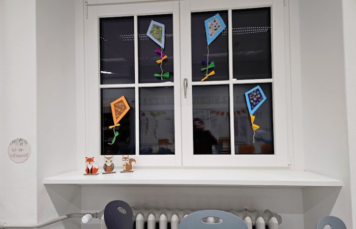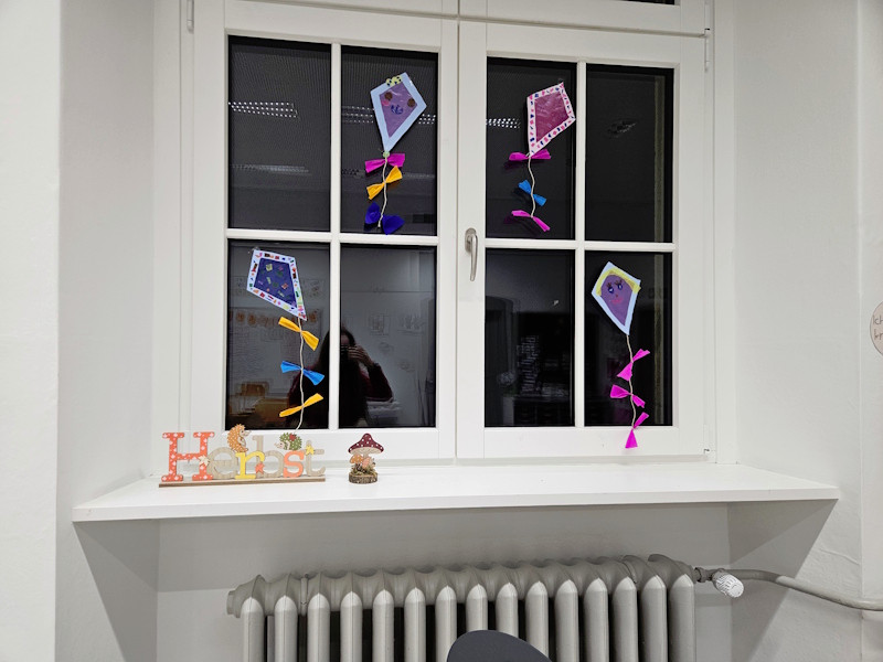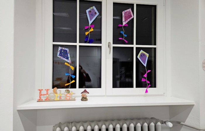 Passend zur Jahreszeit bastelten die Kinder in den ersten Kunststunden leuchtende Drachen aus Ton- und Transparentpapier. Nach einem kleinen Drachenrätsel durfte jedes Kind seinen eigenen Drachen gestalten. Mit Schnur und Kreppband aufgehängt, flattern sie nun fröhlich an unseren Fenstern und bringen Farbe und Leben in den Klassenraum.