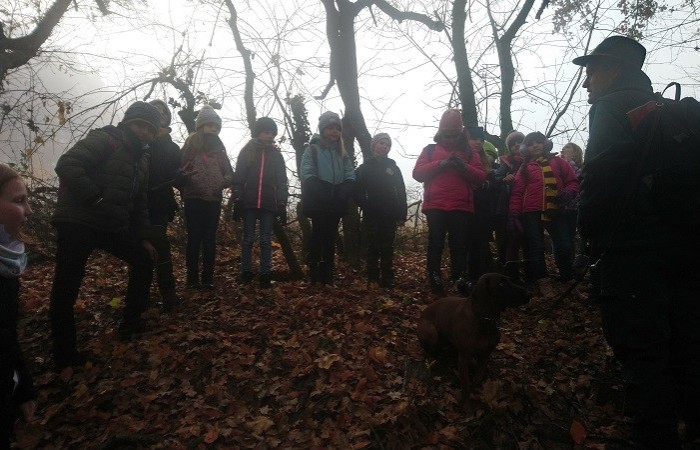 Zuerst wanderten wir zum Wasserhaus, wo uns der Förster in Empfang nahm. Er erklärte zu Beginn, wie wichtig es ist, dass kein Müll im Wald zurückbleibt und wieso die Blätter im Herbst von den Bäumen fallen.