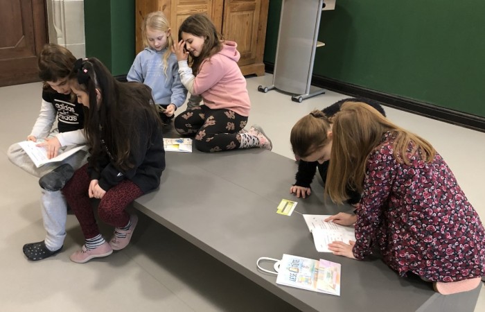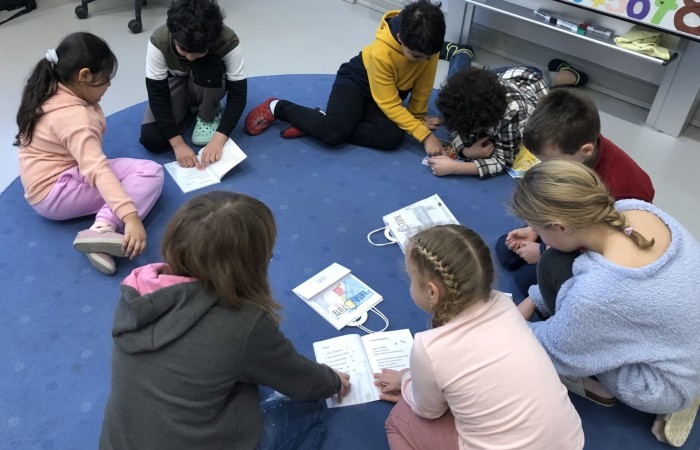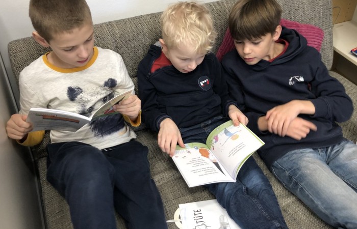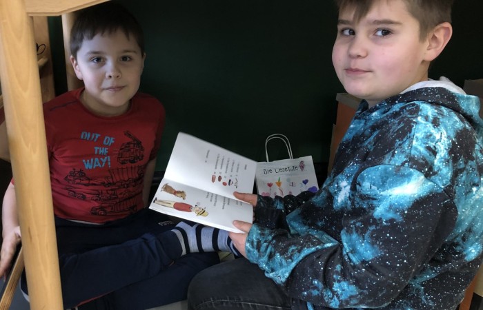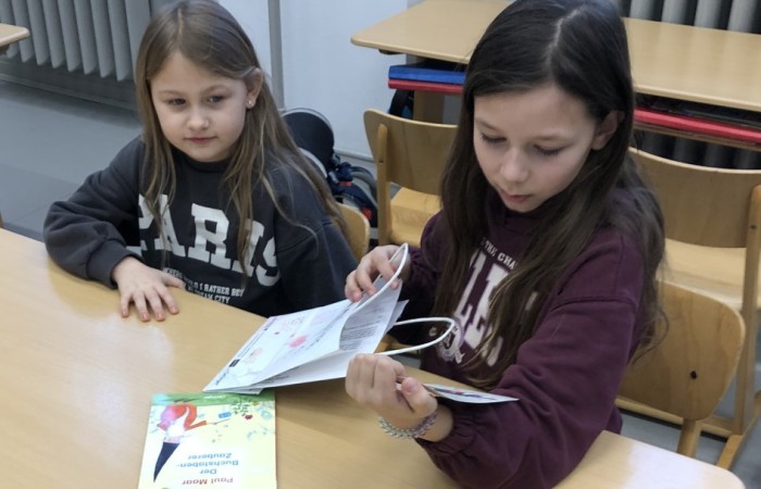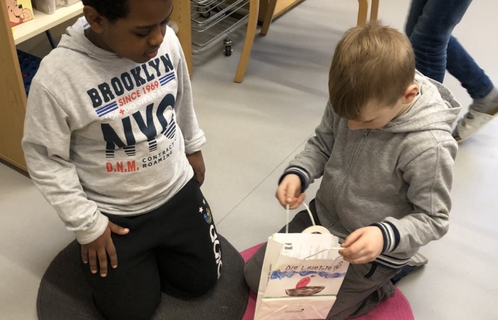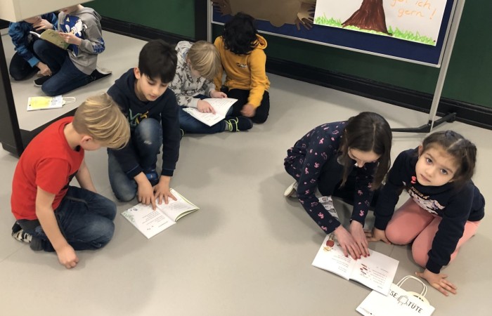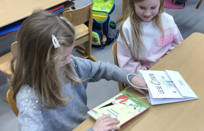 Nachdem die „Großen“ den „Kleinen“ ihre Lese-Tüten feierlich überreicht hatten, haben sich die Kinder jeweils zu zweit in einem Lese-Tandem aus Lese-Profi und Lese-Anfänger im Klassenzimmer und Lichthof verteilt, um gemeinsam in das Buch hineinzulesen.