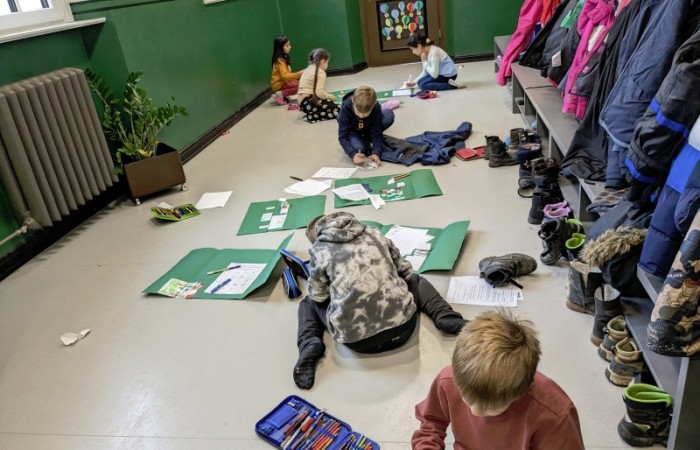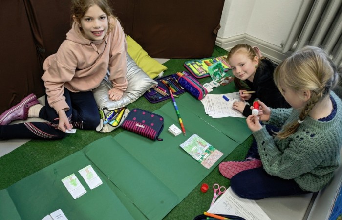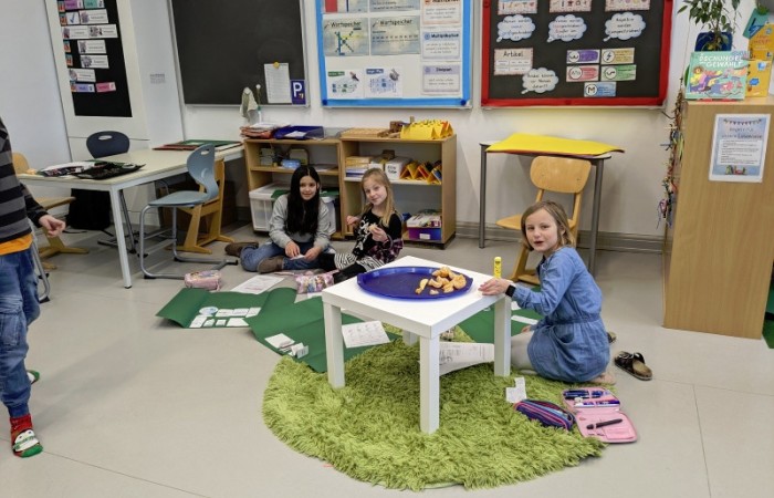 Unsere Informationen hielten wir in unseren kreativ gestalten Lapbooks fest, die wir an flexiblen Arbeitsplätzen erstellen durften. So setzten sich viele Kinder auf dem Boden oder den Teppich, in unsere Lesewiese oder auch an kleinere Tische, um dort in Ruhe zu arbeiten. Unsere Lapbooks möchten wir in der Schule ausstellen, damit sich jeder über das wichtige Thema „Naturschutz und Schutz unserer Wälder“ informieren kann.