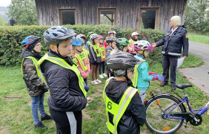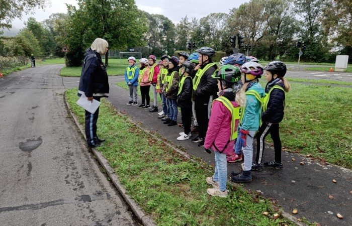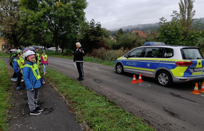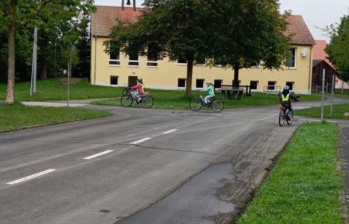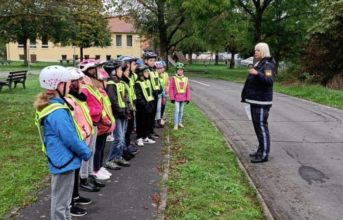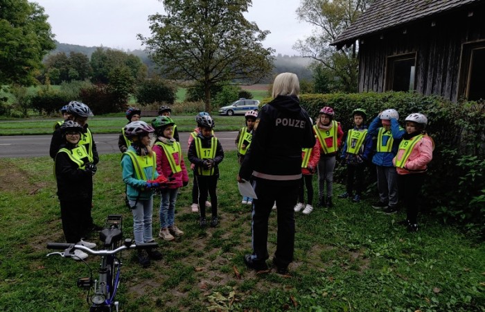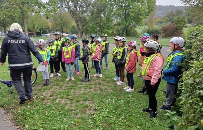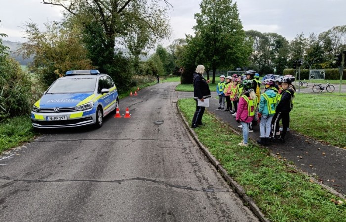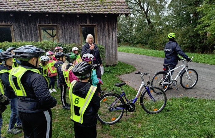 Mit Helm, Handschuhen, warmen Jacken und Pausenbrot ausgestattet machen wir uns die nächsten Wochen jeden Dienstag auf den Weg nach Diebach zum Verkehrsübungsplatz. Die Polizistinnen Frau Lang und Frau Betz erklären uns hier unter anderem wichtige Schilder, das sichere Anfahren, Vorbeifahren am Hindernis und das Abbiegen nach rechts und links. Und auch wenn man beim verkehrssicheren Fahren viel beachten muss – das Fahrradfahren mit den Klassenkameradinnen und Kameraden ist zwar anstrengend, macht aber richtig Spaß!
