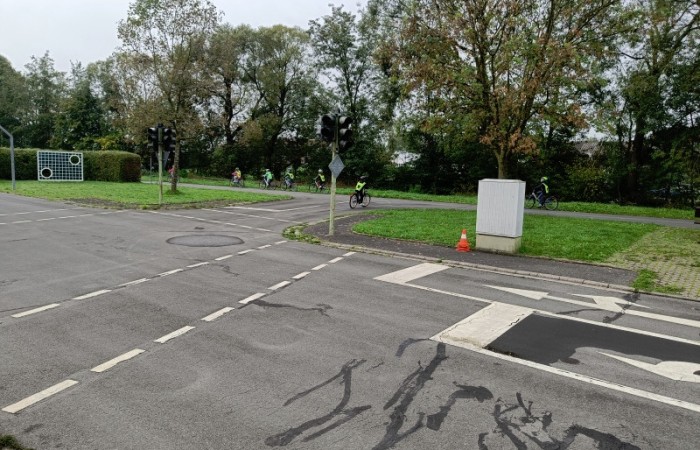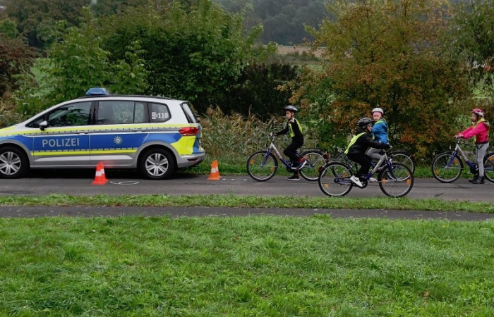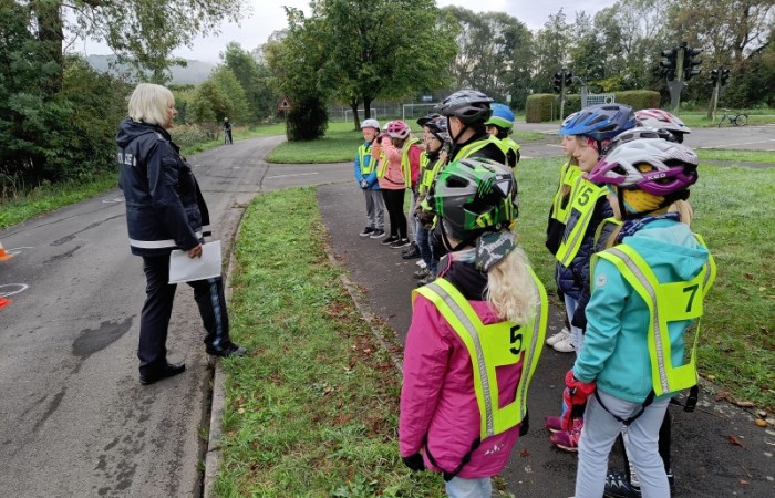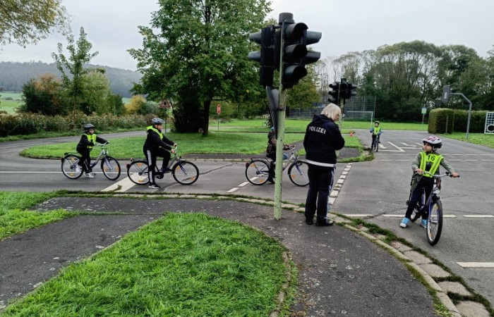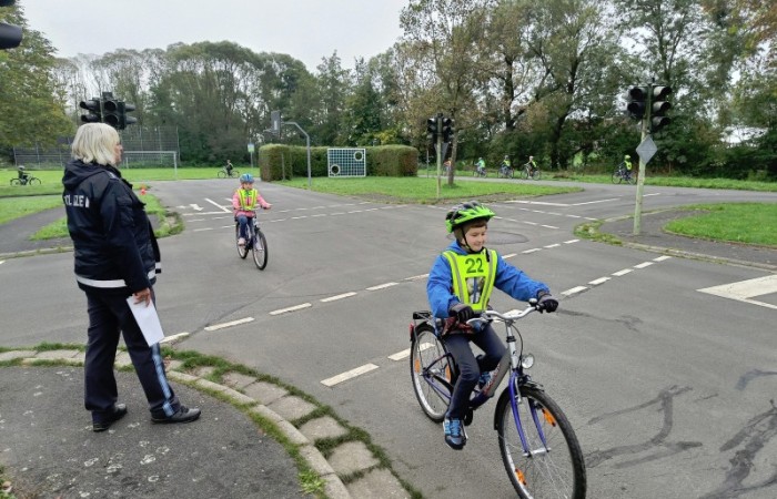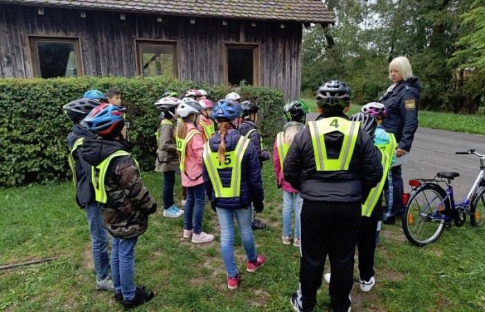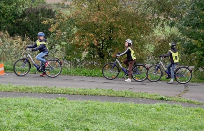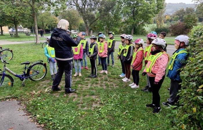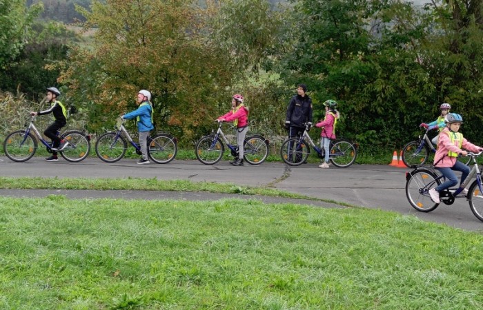 Die Schülerinnen und Schüler der 4a üben gerade ganz fleißig das verkehrssichere Fahrradfahren.