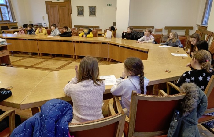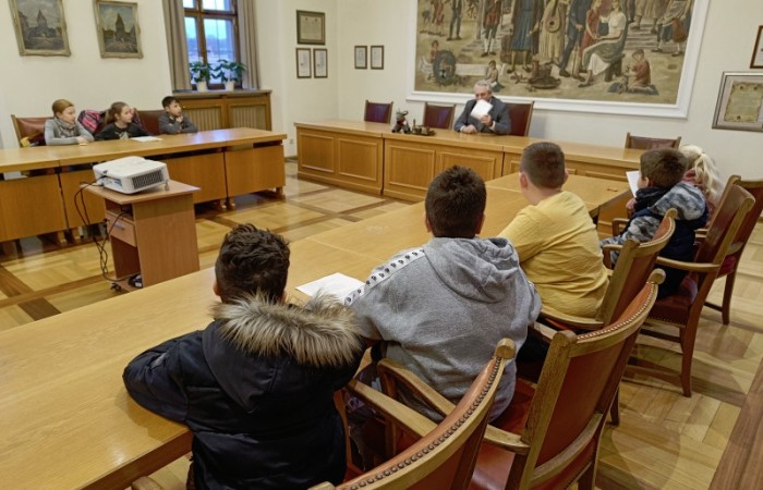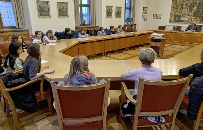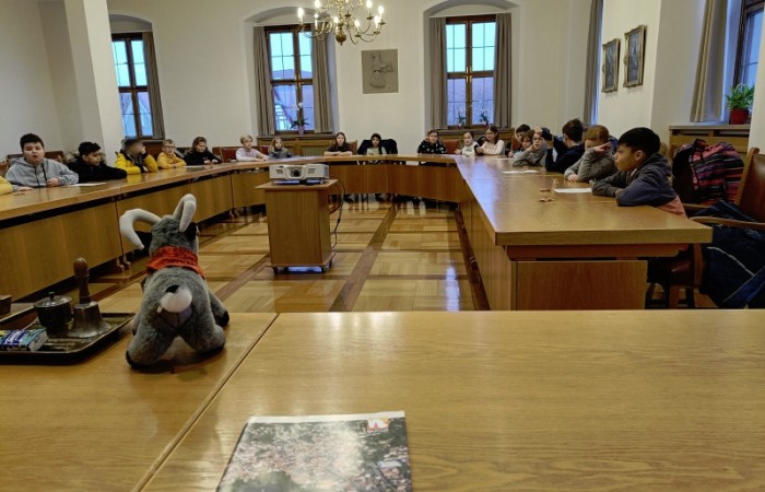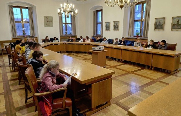 Unser Bürgermeister Herr Meier begrüßte uns persönlich mit Handschlag und wir nahmen im großen Sitzungssaal des Rathauses Platz. Er fragte uns, was wir schon über unsere Heimatstadt wissen und wir konnten schon viele Dinge aufzählen.